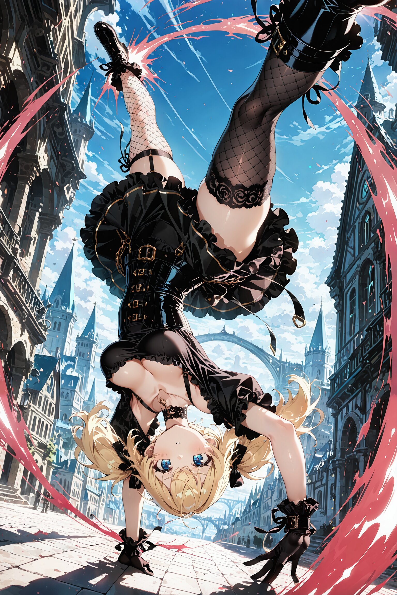 masterpiece, best_quality, year 2024, newest, highres, absurdres, very_aesthetic, ultra_detailed, 8K, vibrant_colors, anime_style, cute, kawaii, anime_eyes, anime_face, detailed_face, detailed_eyes, clothes details, 1girl, solo, model-like physique, toned body, medium breasts, perky breasts, (thick thighs:0.8), skindentation, zettai ryouiki, blond, long hair, blue eyes, twintails, black dress, lace choker, off shoulder dress, gloves, lace choker, short twintails, belt, black belt, sleeves, frills, corset, crossed wrist ribbon, straps, wrapped wrist, collar lace, wrist bondage, black thighhighs, asymmetrical legwear, single thighhigh, single fishnet thighhighs, collarbone, kicking, split, handstand, dynamic pose, foreshortening, extreme perspective, dynamic angle, heroic fantasy citadel city, inside, addmicrodetails