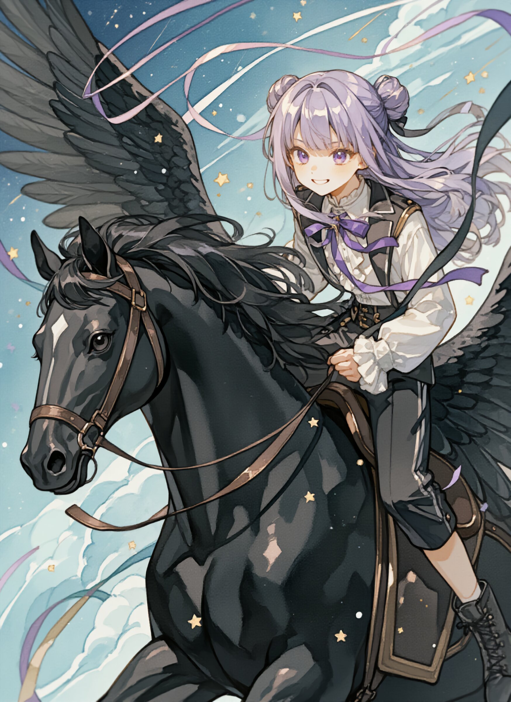 (masterpiece, best quality, detailed painting, soft watercolor style, muted tones, celestial lighting) 1 little otoko no ko, light purple hair, long hair, double bun, straight hair, moe purple eyes, cropped gothic pants, frilled shirt, purple ribbon, ankle boots, flowing ribbons, confident smile, riding a black Pegasus with black wings, soaring through the starry night sky.