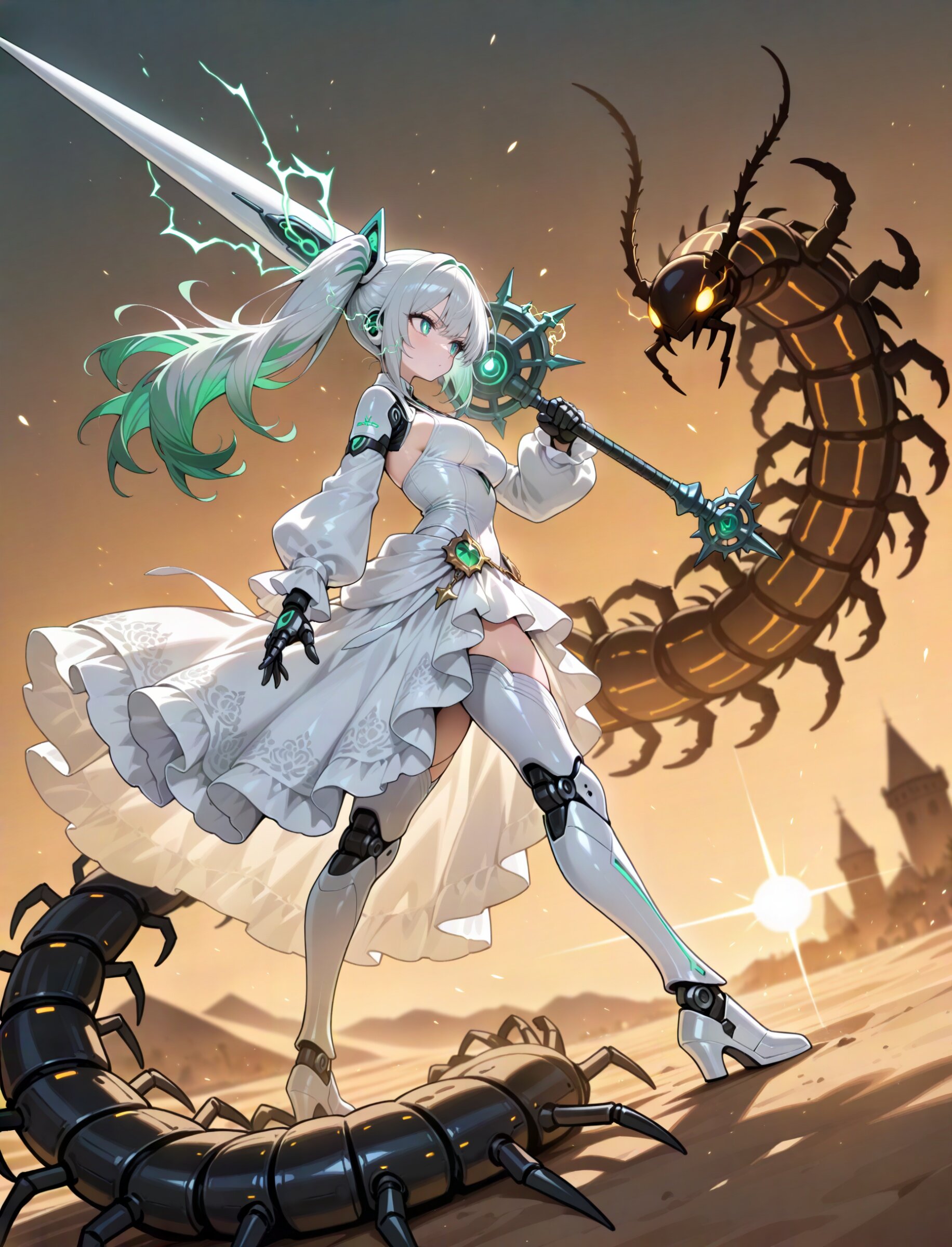 1girl, huge cool lance in hands, holding huge cool weapon mechanism, machine, (fisheye lens angle:1.0),(fisheye lens angle:1.3), looking to the side, (25 years old:1.0), (medium breasts:1.2), (two-tone hair, grey and ever green hair, shoulder length hair, high side ponytail medium bangs:1.0), (beautiful face:1.1), (clear white small eyes:1.0), green pupils , fighting stance, weapon over shoulder, (mechanical black hands:1.0), black robot ears, , (mechanical white legs:1.1), white mechanical thighs, neon trim, medieval times fantasy world, (cybernetic gynoid:1.0), (mech suit:1.0), (white gothic cuirass:1.0), (robot joints:1.0), (white gorgeous modest wizard's dress skirt:1.1), , glossy silver body with metallic luster cyborg, (Decorative embroidery:1.0), (white gorgeous dress:1.1), (overskirt:1.0), (white sleeve:1.2), electrokinesis, (looking away:1.0), from side, (huge garnet silhouette of centipede,serious monster silhouette:1.2), gold desert, arabian,(gradient sky clear weather, feverish,heat haze),, blurry background, fighting, duel, incoming attack super fine concept art, hard surface, 8K, masterpiece, best quality, amazing quality, very aesthetic, absurdres, professional art lots of details, , overexposure, shiny-glistening, (watercolor style:1.0), (pastel color style:1.0) 4ur4_illu,shiny, glowing, glowing particles, glowing light particles, light particles, <lora:noline (1):1.0> <lora:sdxl2-flat2-512b:-0.2> <lora:facelightup_xl_v10:0.5> <lora:V2_yakumo_alchemy:0.5> <lora:Aura_illu:0.1>