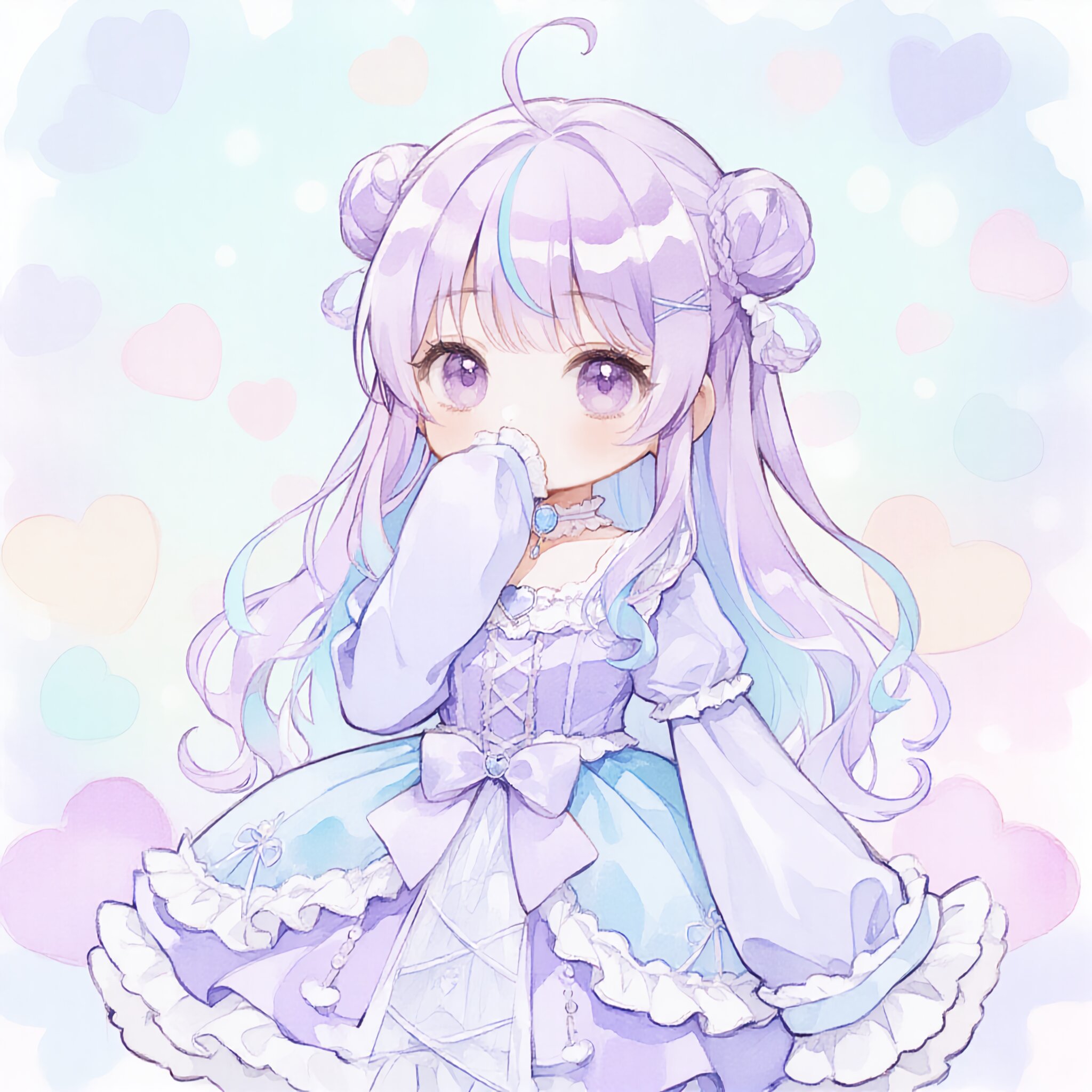 (chibi:1.5), soft pastel palette, cute gentle girl with long lavender hair and light blue highlights, twin side buns with loose curls, one stray hair, large purple eyes, (covering mouth with long sleeves:1.4), sleeves hiding her hands, looking at viewer, looking up, (pastel gothic lolita dress:1.3), lavender and pale blue colors, white lace frills, ribbons, layered chiffon skirt, gem choker, (soft pastel gothic style:1.3), fluffy watercolor texture, elegant and cute, ethereal atmosphere, soft pastel hearts in the background, floating hearts, gentle bokeh effect, light pink and lavender tones, dreamy atmosphere, (cute background:1.2), (masterpiece, best quality, ultra-detailed, anime style, 8k illustration)