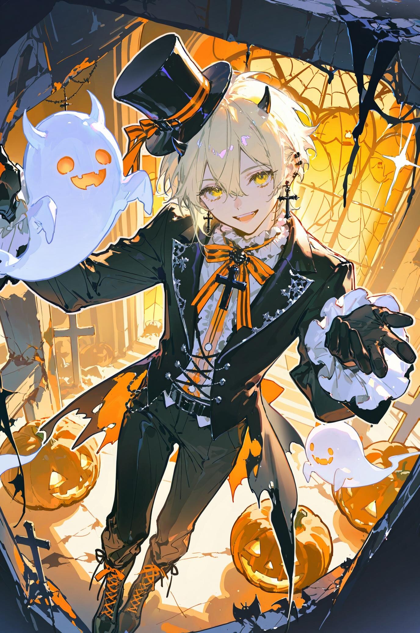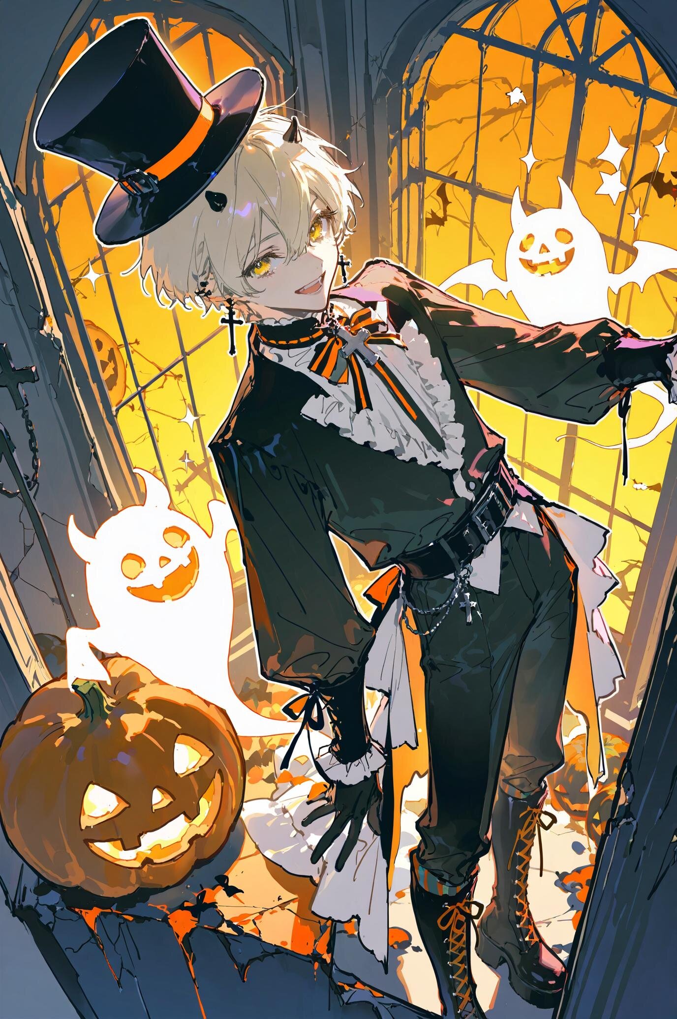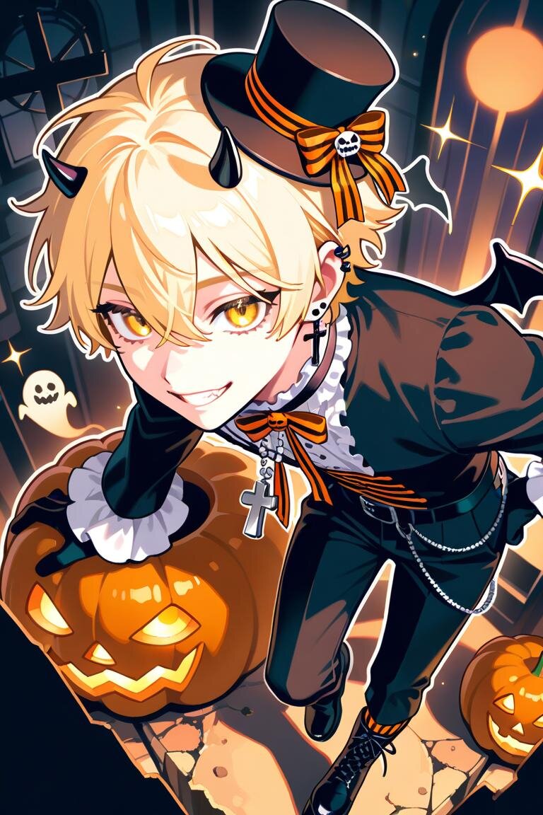 ハッピーハロウィン!🎃🦇 黒い衣装とトップハット姿が最高にセクシーで格好いいです!🎩✨ 悪魔の角と黄色の瞳が、ハロウィンの夜にぴったりな魅力を放っていますね。👻のイラストも可愛らしくて、ダークだけど楽しげな雰囲気が伝わってきます!🧡🖤