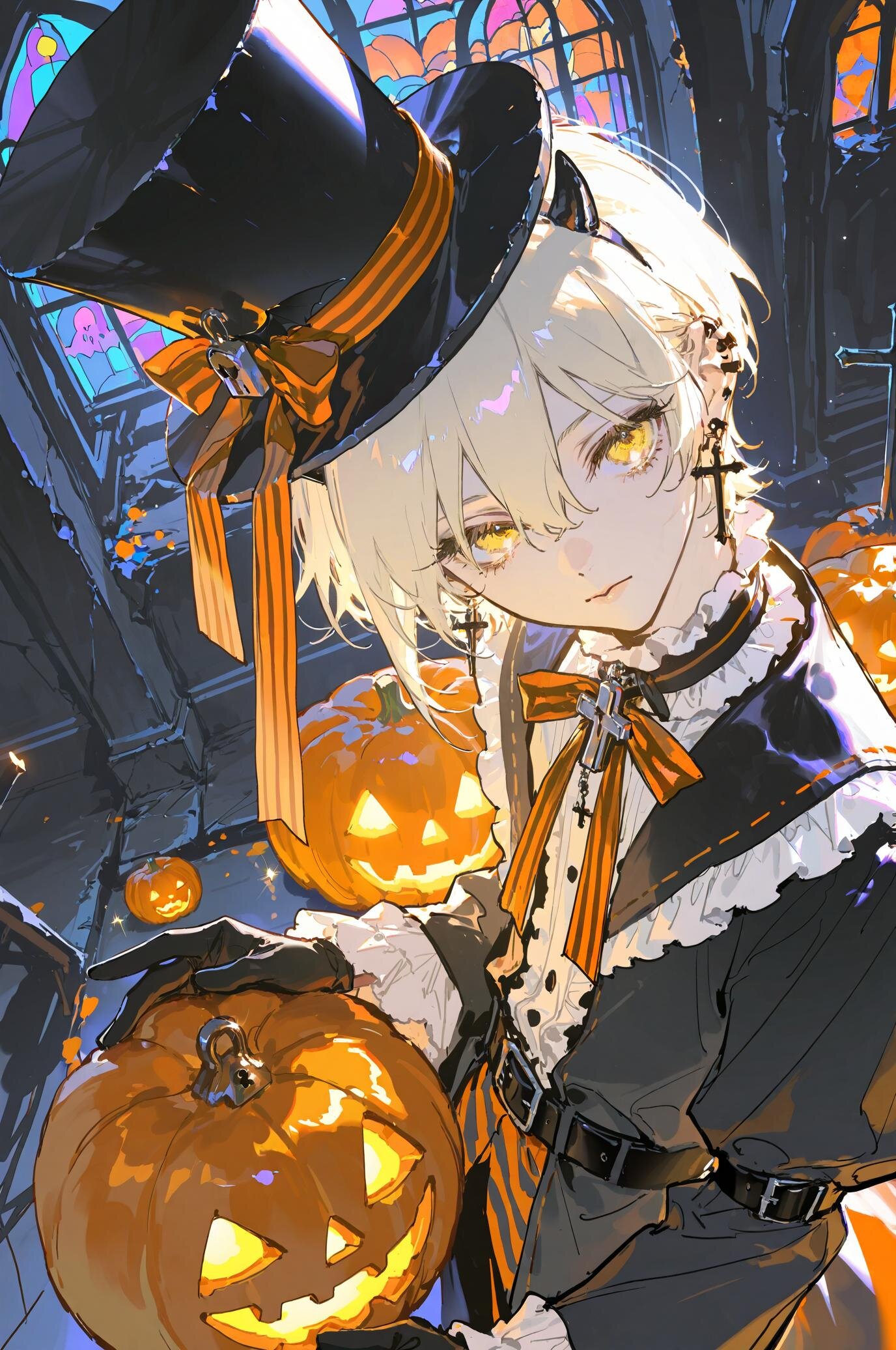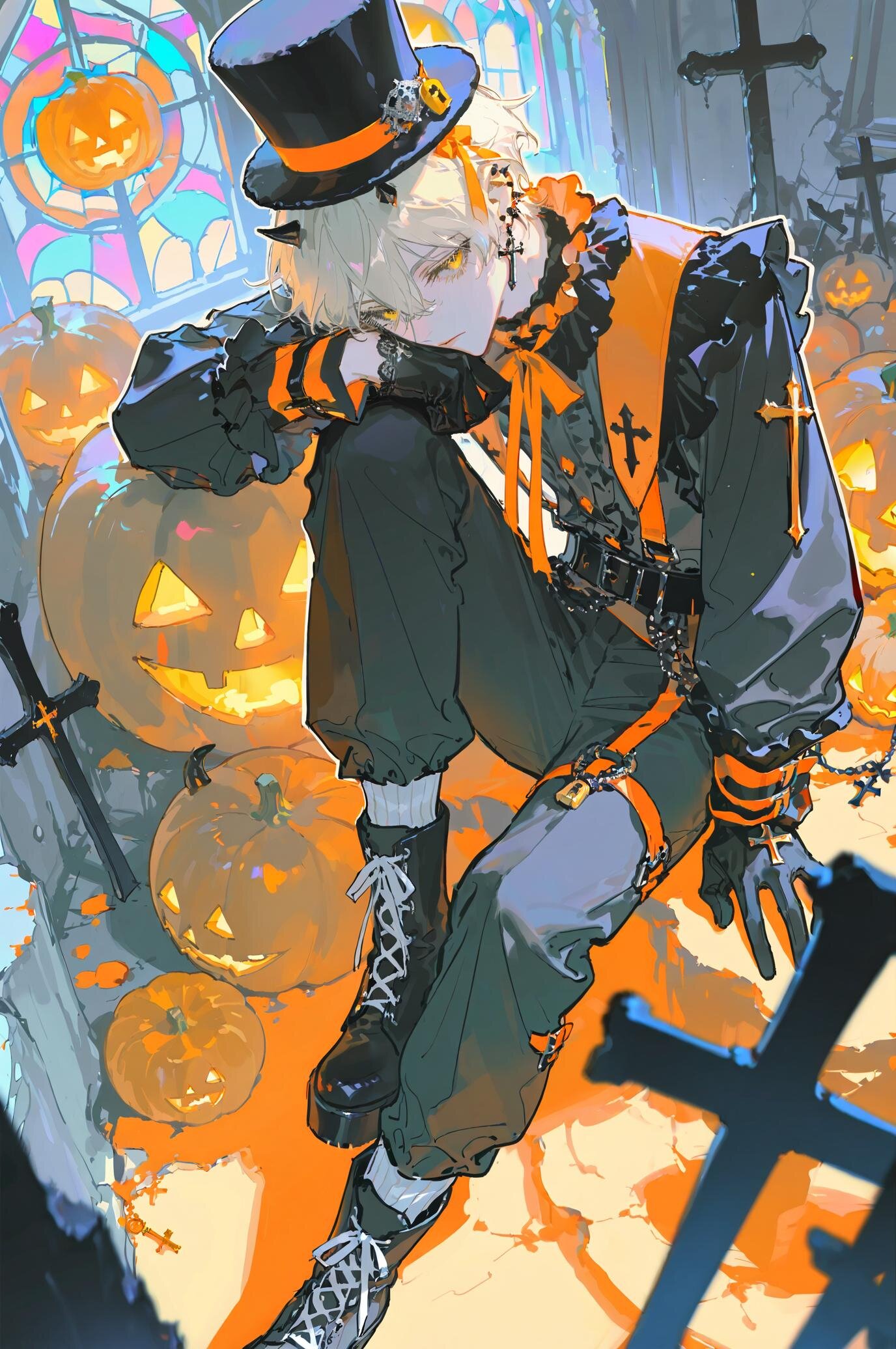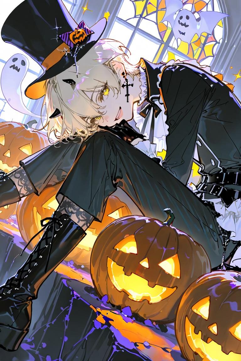 ハッピーハロウィン!🎃🦇 黒い衣装とトップハット姿が最高にセクシーで格好いいです!🎩✨ 悪魔の角と黄色の瞳が、ハロウィンの夜にぴったりな魅力を放っていますね。👻のイラストも可愛らしくて、ダークだけど楽しげな雰囲気が伝わってきます!🧡🖤
