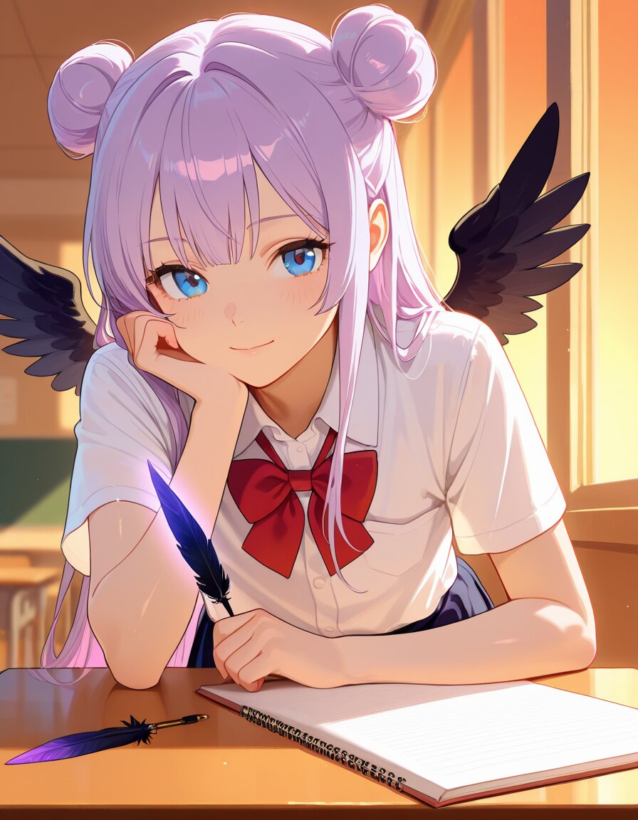 A cute and elegant young male student (boy in a girl's style),kawaii,(flat chest:1.4),pastel color Light purple hair,long hair,double bun,white short sleeve shirt,red bow tie,Black Fallen Angel's Wings, sitting by the classroom window,observing the schoolyard outside with curiosity,resting his chin on one hand,slightly leaning forward,relaxed posture,one leg crossed,soft and intelligent expression. On the desk: a notebook,a glowing magical crystal,a feather pen,subtle fantasy elements. Late afternoon sunlight streaming through the window,warm soft lighting,orange and purple sunset tones,gentle shadows,realistic anime style,highly detailed,cinematic atmosphere.,, (best quality,masterpiece:1.4),(high resolution,super fine illustration:1.36),shiny skin,finely,detailed face,japaneese idol