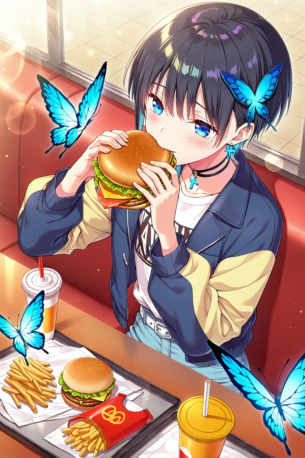 (masterpiece:1.4), (best quality:1.4), (ultra-detailed:1.3), (highly detailed anime illustration:1.4), (androgynous:1.3), (boyish:1.2), (anime style:1.4), (very short hair:1.3), (glossy black hair:1.3), (Nakano Ichika hairstyle:1.2), (blue inner hair:1.2), (blue eyes:1.3), (big blue butterfly hair accessory:1.3), (cross lace choker:1.2), (blue glowing cross earrings:1.2), (casual stylish outfit:1.2), (black and blue layered jacket:1.2), (white undershirt:1.1), (slim-fit pants:1.1), (silver belt buckle:1.1), (sitting at a table:1.3), (holding a hamburger with both hands:1.3), (taking a bite of burger:1.2), (tray with fries and drink:1.2), (modern food court interior:1.3), (angled view:1.3), (dynamic composition:1.2), (soft afternoon lighting:1.2), (warm tone:1.1), (vibrant colors:1.1), (clean smooth line art:1.2), (depth of field:1.1), (bokeh background:1.1), (relaxed expression:1.2), (cozy urban atmosphere:1.1), (vivid anime coloring:1.2), (cel shading:1.1), (bright soft light:1.1)