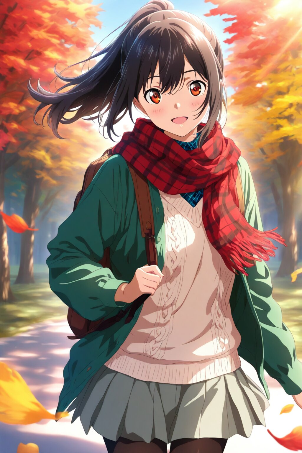 masterpiece, best quality, extremely detailed, highly detailed, ultra-detailed, finely detailed, sharp focus, intricate details, realistic lighting, dynamic lighting, vivid colors, 1girl, youthful girl, cheerful expression, smiling, energetic pose, autumn mountain background, colorful fall foliage, red and yellow leaves, warm sunlight, gentle wind, anime style illustration, soft shading, highly detailed background, SNS aesthetic, bright atmosphere, depth of field, dynamic composition, casual outdoor fashion, autumn outfit, layered clothing, red flannel checkered shirt, beige knit sweater underneath, olive green jacket, short pleated skirt with dark tights, brown hiking boots, small backpack, scarf fluttering in the wind, black hair in ponytail, amber eyes, blushing cheeks, sunlight filtering through trees, detailed hair, soft lighting, vibrant art style, high detail, 12 years old, svelte body, small breasts, petite, anatomically correct,