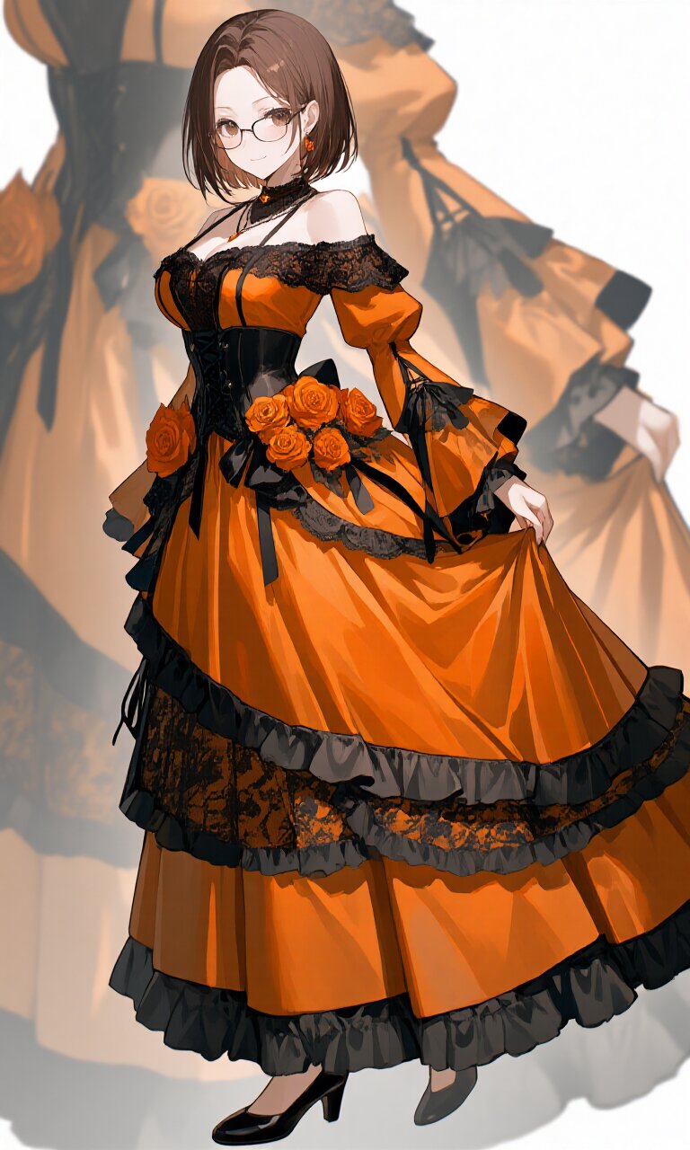 Brown hair, brown eyes, forehead, glasses, short hair. The orange gothic dress, richly gathered, is accented with a black corset and a black lace ribbon belt. The off-shoulder dress features black lace elegantly adorning the neckline, while black rose lace delicately trims the orange satin dress. Asymmetrical front and back, the elegantly flowing hem layers multiple lace overlays, generously adorned with orange artificial roses.black heel and orange rose accessory