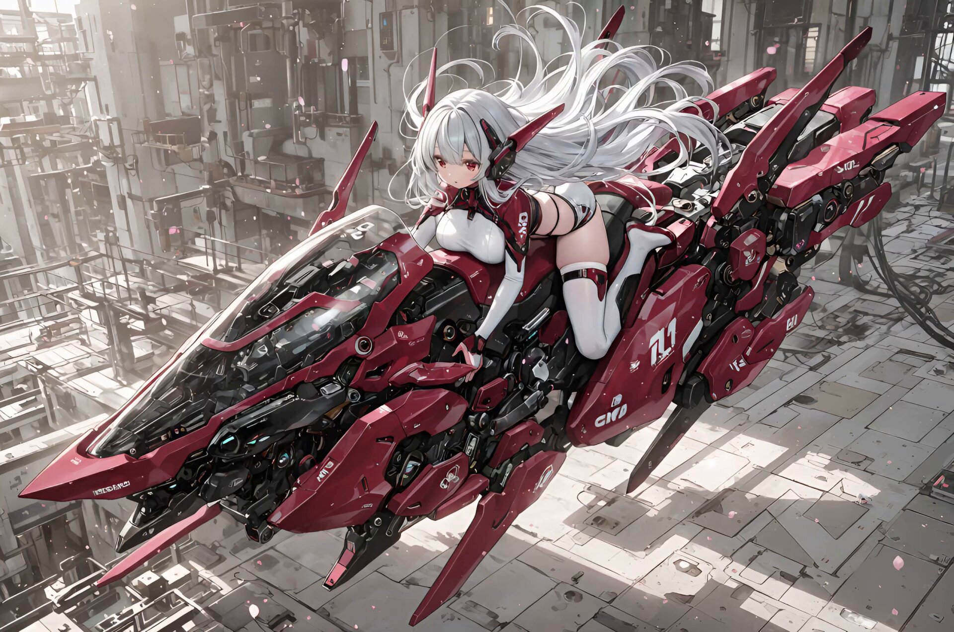 futuristic high speed mech bike, rear engine ignition sequence, powerful thrusters activate at the back of the vehicle, glowing energy exhaust, cinematic mechanical startup, red sci-fi jet bike hovering, anime silver-haired girl pilot leaning forward, hair flowing in wind, mechanical vibration, intense engine power build-up, smooth acceleration, rapid launch forward, futuristic hangar environment, cyber mechanical design, dynamic motion, ultra detailed mechanical parts, high tech engine glow, cinematic lighting, energy particles, motion blur, high quality anime sci-fi style, rear engine lights up → thrusters charge energy → engine ignites → vehicle accelerates forward rapidly → camera follows slightly from side