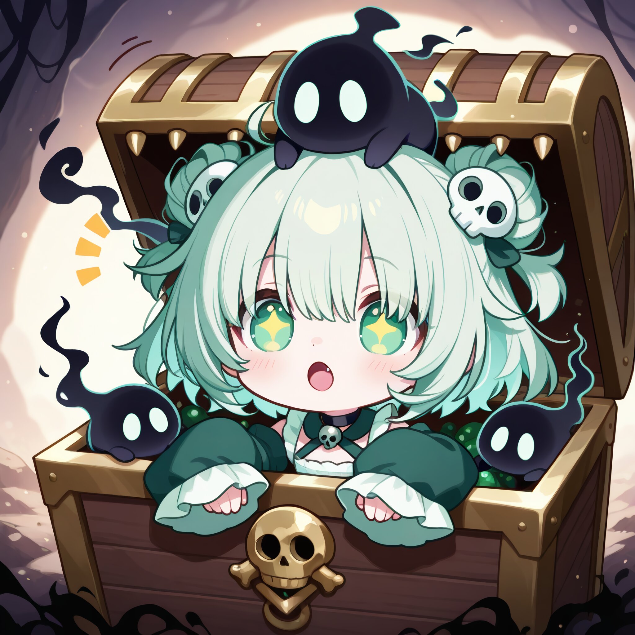 (masterpiece, best quality, chibi style, pastel horror, cute fantasy, soft shading, warm color palette, stylized motion), 1 little girl, cobalt green short messy hair, (hair over eyes:1.2), green eyes, +_+, open mouth smile, :o, choker, green wa maid outfit, (oversized sleeves:1.2), detached sleeves, cat on head, skull hair ornament, (floating black ghosty hands:1.2), notice lines, the girl is inside a mimic chest, holding onto the edge of the box, the box looks like a normal wooden treasure chest with dull gold metal rims, a few cute fangs are growing from the mouth of the chest, soft warm lighting, dynamic composition, cute atmosphere.