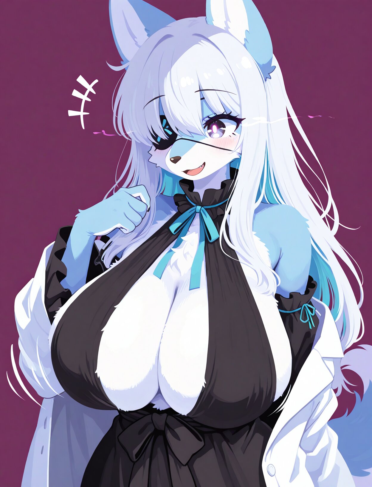 1girl,(wolf girl),(furry female),(snout:1.3),blue fur,wolf ears,ears up,wolf tail,fluffy fur,body fur,(gigantic breasts),sagging breasts,curvy,narrow waist,silver hair,hime-cut,long hair,colored inner hair,hair over eyes,hair between eyes,silver eyes,glowing eyes,eyepatch,eye trail,long bangs,high collar,frilled collar,halterneck,blue neck ribbon with loose ends,bare shoulders,revealing clothes,undersized clothes,emphasize deep breasts cleavage,plunging neckline,white jacket on shoulders,evening gown,black dress,black sling top,frill-trimmed dress,sleeveless dress,sideboobs,high-waist sideboobs,cleavage cutout,center-opening,clothing cutout,cleavage,large waist bow,detached sleeves,frilled sleeves,wide sleeves,smile,laughing,+++,motion lines,motion blur,motion trail,afterimage,perspective,foreshadowing,white outlines,purple background,simple background,looking ahead,breast focus,close-up,from side,hair shade,((low contrast)),(digital art:1.1),(anime coloring),(kawaii),softy,(2D),(cute),furry,(two tone fur),(furry body),perfect body,detailed face,high quality,cute clothes,animal tail,animal ears,solo,masterpiece,((correct_anatomy)),pretty and cute, comical, simple, anime,anime style,smooth lineart,clean and smooth lineart,thin and precise outlines,soft shading,vibrant colors,thin lineart,beautiful lineart,beautiful eyelashes,Bright colors, Contour line, pale painting,gddw,(detailed_hands:1.5),flat color, no lineart,close-up, eye focus,close-up,furry,(two tone fur),(furry body),perfect body,detailed face,high quality,cute clothes,animal tail,animal ears,solo,masterpiece,Bright colors,Contour line,pale painting,gddw,(detailed_hands:1.5),flat color,no lineart,close-up,eye focus