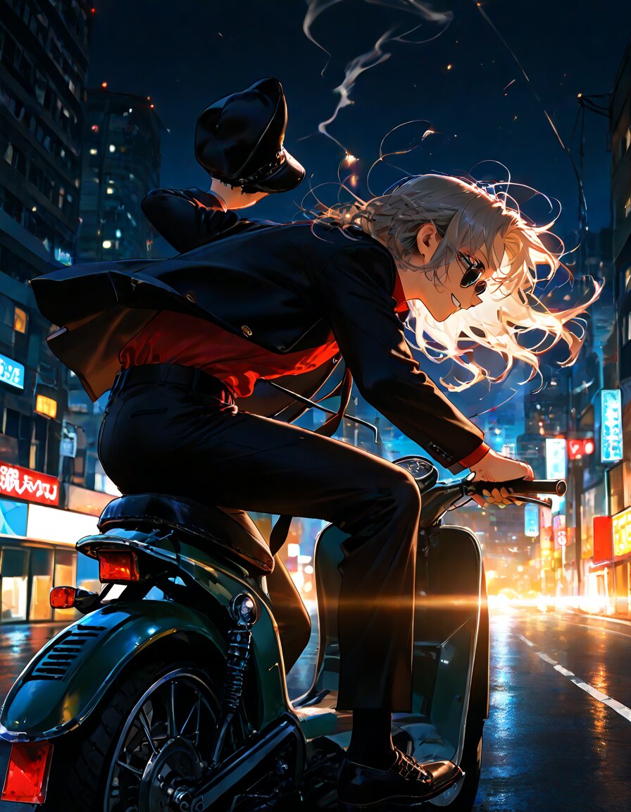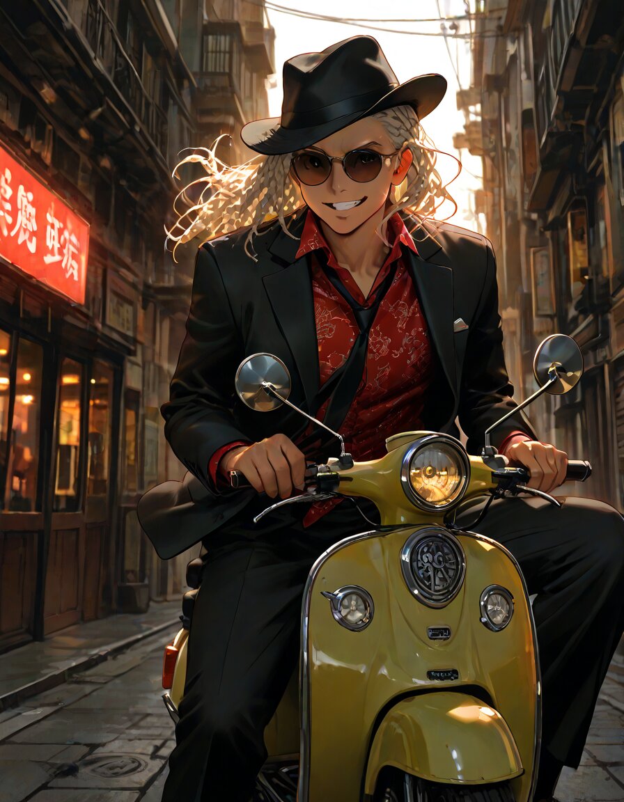 Detective Story, comical. Middle-aged, 1man, riding Vespa scooter, looking side, platinum blonde dreadlocks loosely tied, black hat, hand on hat, floating hair, black suit with red shirt and black tie, tiny round sunglasses, thin grin, smoking. 8K full-colored main visual, semirealistic anime style, fine line shadow expression:0.8, (hard-boiled illustration, flat colors, ultra-intricate detailed), patterned fabric, beautiful composition. BREAK (masterpiece, aesthetic quality, 8K, intricate highly detailed), perfect design, amazing quality, high quality, absurdres, highres, cinematic lighting, street background, Maximum Detailed background, (perfect face), (best quality, very aesthetic), newest, add-detail, intricate colors, vibrant colors, score_9, score_8_up, score_7_up, score_6_up, source_anime, <lora:Worldly_XL:1>