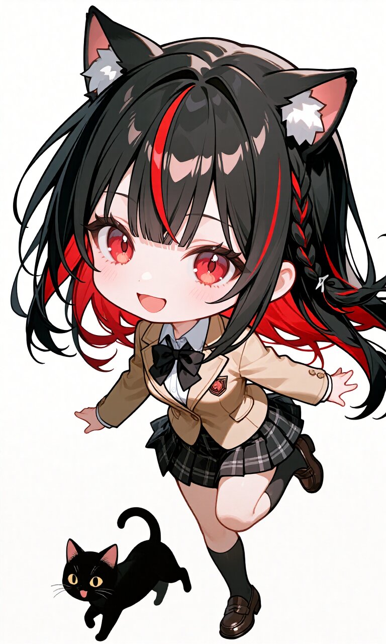 A (chibi:1.5) teenage girl with a soft anime face, delicate features, and highly detailed skin stands in a happy pose against a simple white background. She has long black hair with vibrant red streaks, styled with floating strands for a dynamic effect, and cute cat ears atop her head. Her large, expressive red eyes sparkle with joy as she smiles brightly. She wears a school uniform consisting of a beige jacket over a white blouse with a black bowtie, a plaid black mini-skirt that floats slightly as if caught in motion, knee socks, and polished loafers—suggesting she’s mid-run. A playful black cat accompanies her, adding to the kawaii atmosphere. The art style is deformed yet insanely detailed, with a 16k masterpiece quality, emphasizing cuteness, vibrant colors, and lively motion. The background remains minimal to keep focus on the character’s cheerful energy.