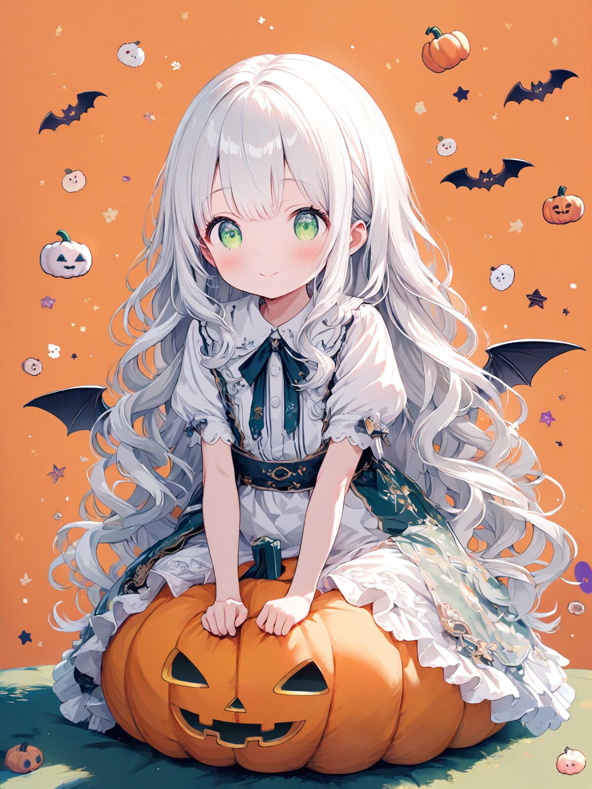 white hair, wavy hair, green eyes, pumpkin soft cushion, living, cute little girl, (tareme:0.6), simple orange background, kawaii background, Halloween costume, little smile, full body, (sharp, 8k, Ultra Super Fine detailed beautiful illustration), 8k resolution, masterpiece, beautiful highlight, expression eyes, beautiful eyes, detailed hair, detailed eyes, semi realistic
