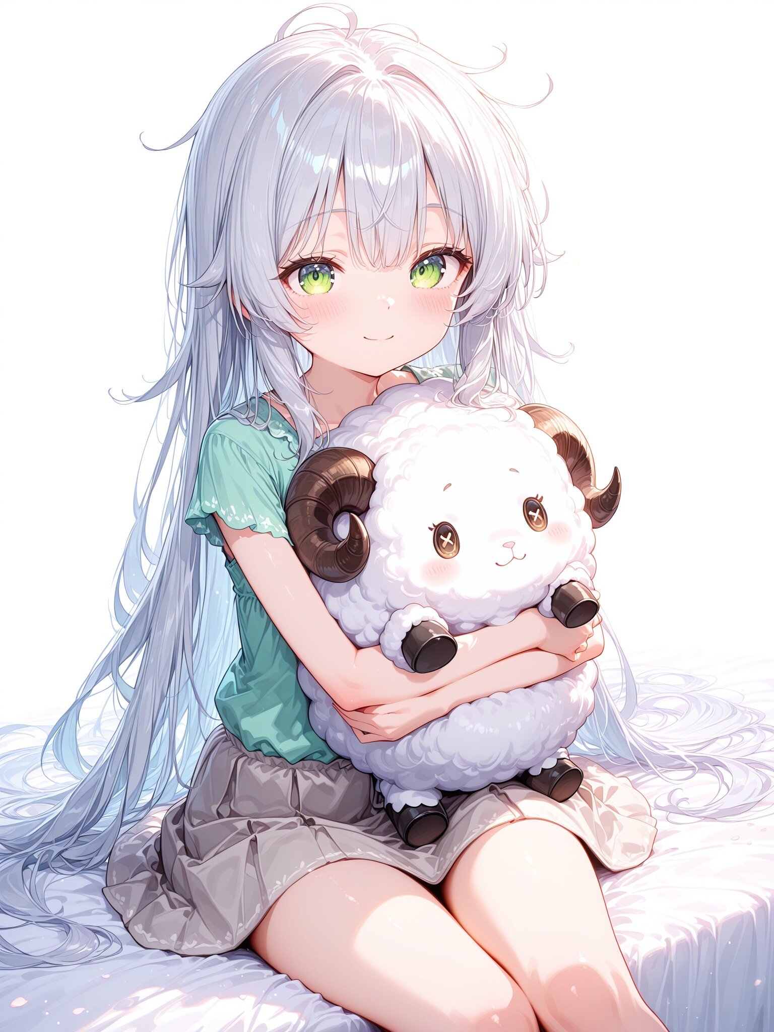anime style, soft pastel colors, clean lines, masterpiece, a cute girl with long silver hair and bright green eyes, wearing a light green short-sleeved top and gray skirt, sitting and gently hugging a large fluffy white sheep plush, soft lighting, warm gentle atmosphere, pure and innocent expression, hair softly flowing, delicate shading, calm smile,