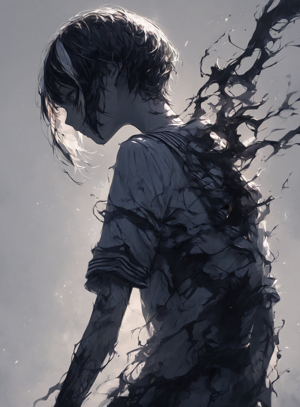 best quality, high res, 4k illustration, 1girl, slender, profile, upper body, detailed pale skin, white short sleeves serafuku, looking down, facing right, detailed streaked pixie cut, detailed eyes, simple background, gray background, cinemaic shadows, cinematic lighting, small breast,