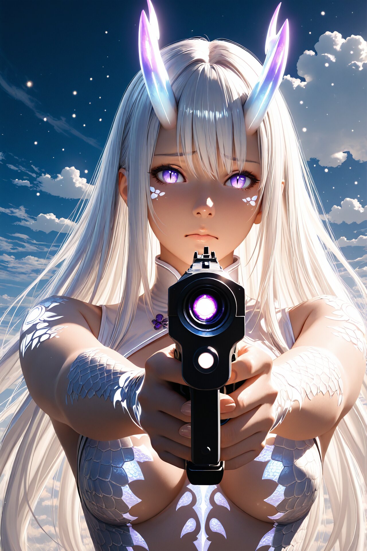 (dragon's horn, dragon's fang, dragon's wing, dragon's claw, slit pupils, amethyst eyes, silver-white hair, scales on cheeks and shoulders and along the spine, worried:1.2), Experiencing chaos right after being transported, startled, spring, afternoon, sunny, (following a strange signal:1.05), (storm cloud buildup:1.1), healing herb basket, (aiming a gun:1.2), angled horizon,