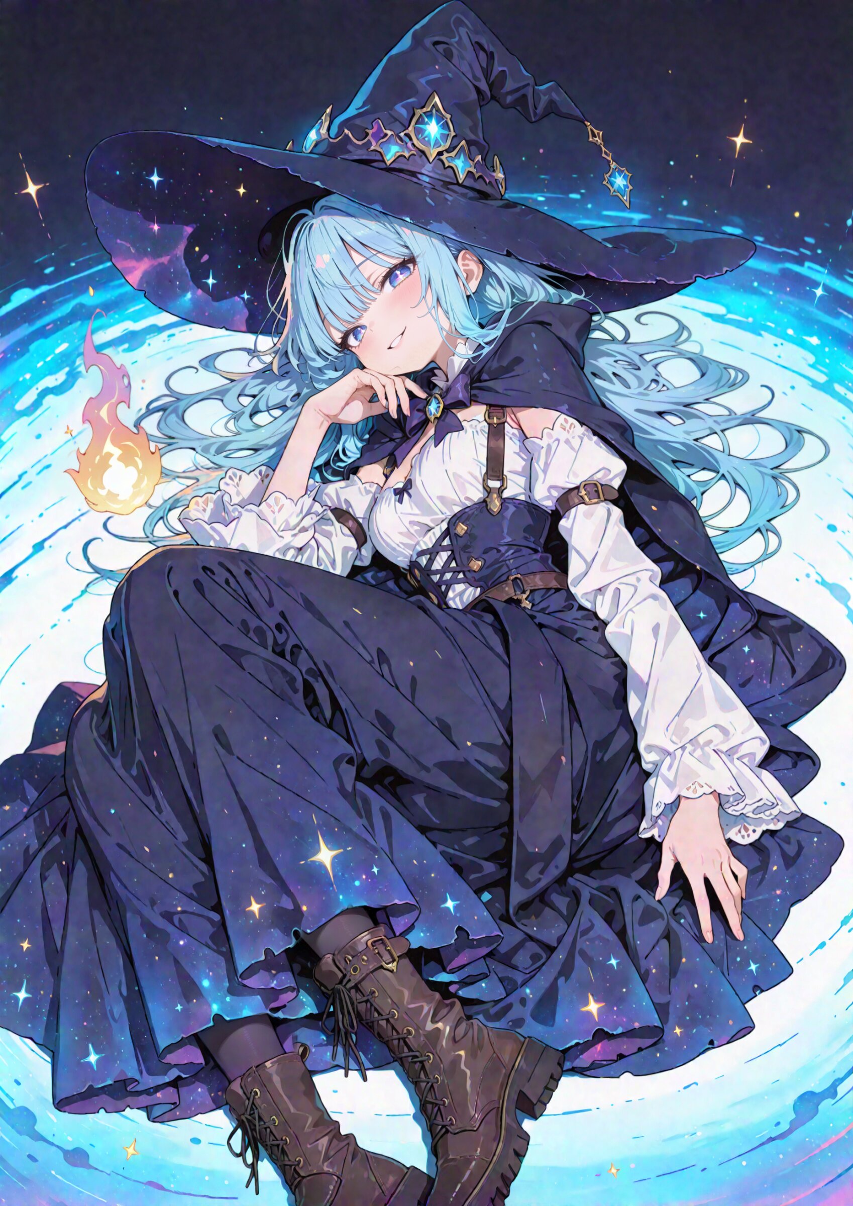 intense angle, from side, (from above,looking up:1.2), close to viewer looking at viewer, 1girl, witch girl, blue eyes, beautiful iridescence eyes, beautiful detailed eyes, beautiful light blue hair, long bangs, long disheveled beautiful hair, first-rate female bodies, perfect body, beautiful breasts, framed breasts, cool face, (Beautiful Lips:0.7),, long hair, (stylish beautiful witch dress:1.2), detached sleeves, (cute blue and dark blue witch girl costume:0.9), (white blouse:1.3), bow tie, witch long skirt (overskirt:1.1) black cloak, (blue galaxy witch hat:1.1), lace-up boots on feet, stockings and suspenders,, mysterious face, smirk arc flash, underlighting, on side, masterpiece, best quality, amazing quality, very aesthetic, absurdres, newest, you can add scenery, (volumetric lighting), To make the background more distinctive. professional art lots of details, , overexposure, shiny-glistening, (watercolor style:1.0), (pastel color style:1.0) 4ur4_illu,shiny, glowing, glowing particles, yellow flame, <lora:noline (1):-0.5> <lora:sdxl2-flat2-512b:0.0> <lora:facelightup_xl_v10:0.5> <lora:V2_yakumo_alchemy:0.5> <lora:Aura_illu:0.1>