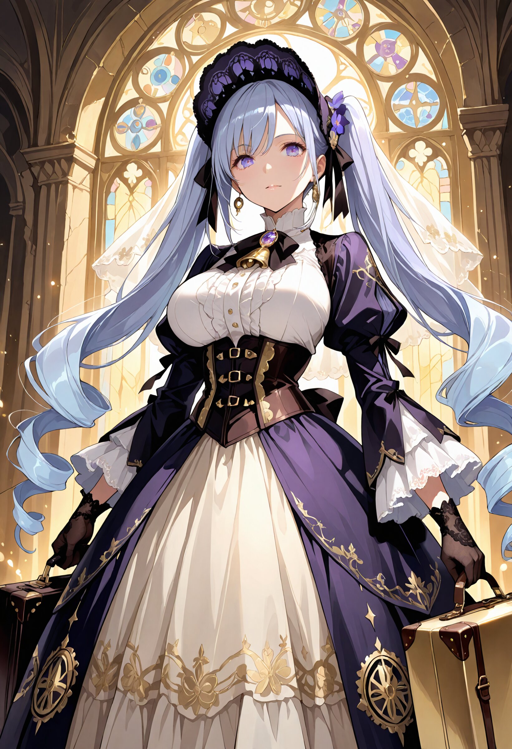 a beautiful mechanical angel girl standing in the ruins of an ancient civilization at sunset, soft golden light filtering through broken stained glass and floating dust particles. she has light blue twin-drill twintail hair, violet eyes, and a voluptuous G-cup figure, her expression calm and melancholic yet gentle. she hides her angelic wings, but a faint ethereal halo glimmers softly behind her. she wears an ivory and faded gold antique baroque lolita dress, mechanical doll couture, corset with brass filigree and lace embroidery, long bell lace sleeves, high collar with cameo brooch, vintage lace bonnet veil with golden trim, skirt embroidered with clockwork and floral motifs, faint opal gemstone decorations, lace gloves, gold jewelry and metallic ornaments, holding a miniature suitcase-style handbag designed like a golden music box. soft layered fabrics, refined antique luxury, cinematic lighting, detailed baroque doll lolita fashion, melancholic yet serene atmosphere, elegant and ethereal style, warm sunset glow, volumetric light, golden dust particles, (light blue twin-drill twintails:1.4), (large breasts:1.3), (G-cup figure:1.3), (violet eyes:1.3), (baroque lolita fashion:1.2), masterpiece, best quality, ultra-detailed, 8k, highly detailed eyes, perfect face, realistic lighting, intricate textures, sharp focus, illustration by master artists, depth of field, ornate design, atmospheric composition, realistic skin texture, dynamic lighting