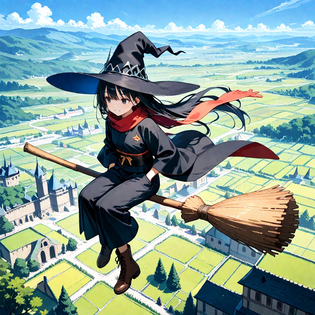 masterpiece,best quality,general,1girl,solo,(hands in pockets,A girl is sitting on side on a broom, flying high in the sky,broom riding,looking away),17 years old,cute girl,slender,small breasts,very long sleeves,(light smile, grin),black hair,long hair,black eyes,Witch girl,(wide-brimmed Witch's black hat,long red scarf,very long black Witch's cloak,very long black Witch's kimono robe, black obi,long black cargo pants),boots,slender girl,full body,Hair and clothes fluttering violently in the wind,from above,very wide shot,Sunny day,seeing the castle town at feet,Fantasy,
