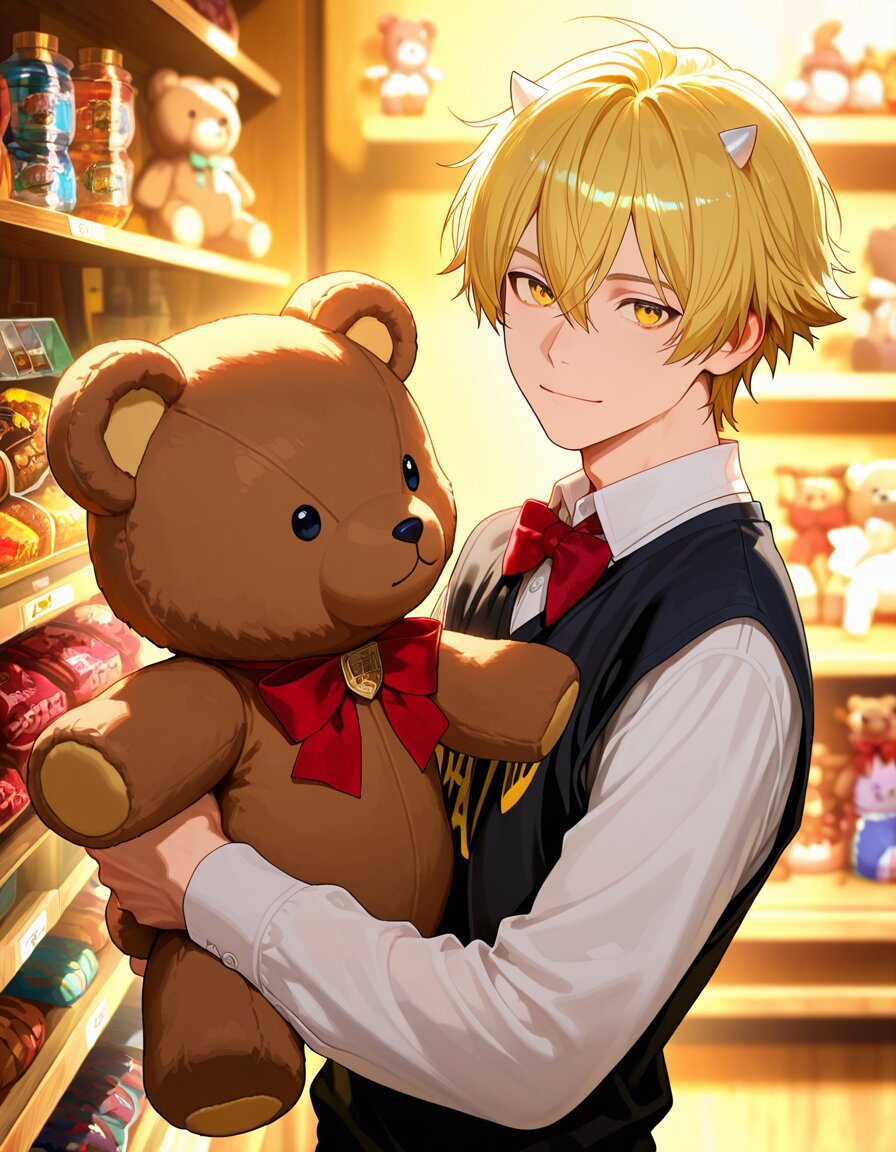 1male,solo,blonde hair,short hair,hair between eyes,yellow eyes,small horns on head, standing in front of a shelf in a plush toy store,holding a teddy bear in his hands while choosing,red bow tie,(gentle smile:0.4),soft eyes,warm lighting,cozy and cute atmosphere,detailed anime style,realistic proportions,soft shading,wearing a white long-sleeve shirt under a black short-sleeve printed shirt,, (best quality,masterpiece:1.4),(high resolution,super fine illustration:1.36),shiny skin,finely,detailed face,japaneese idol