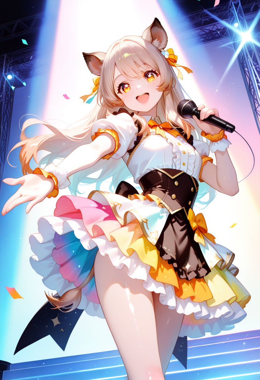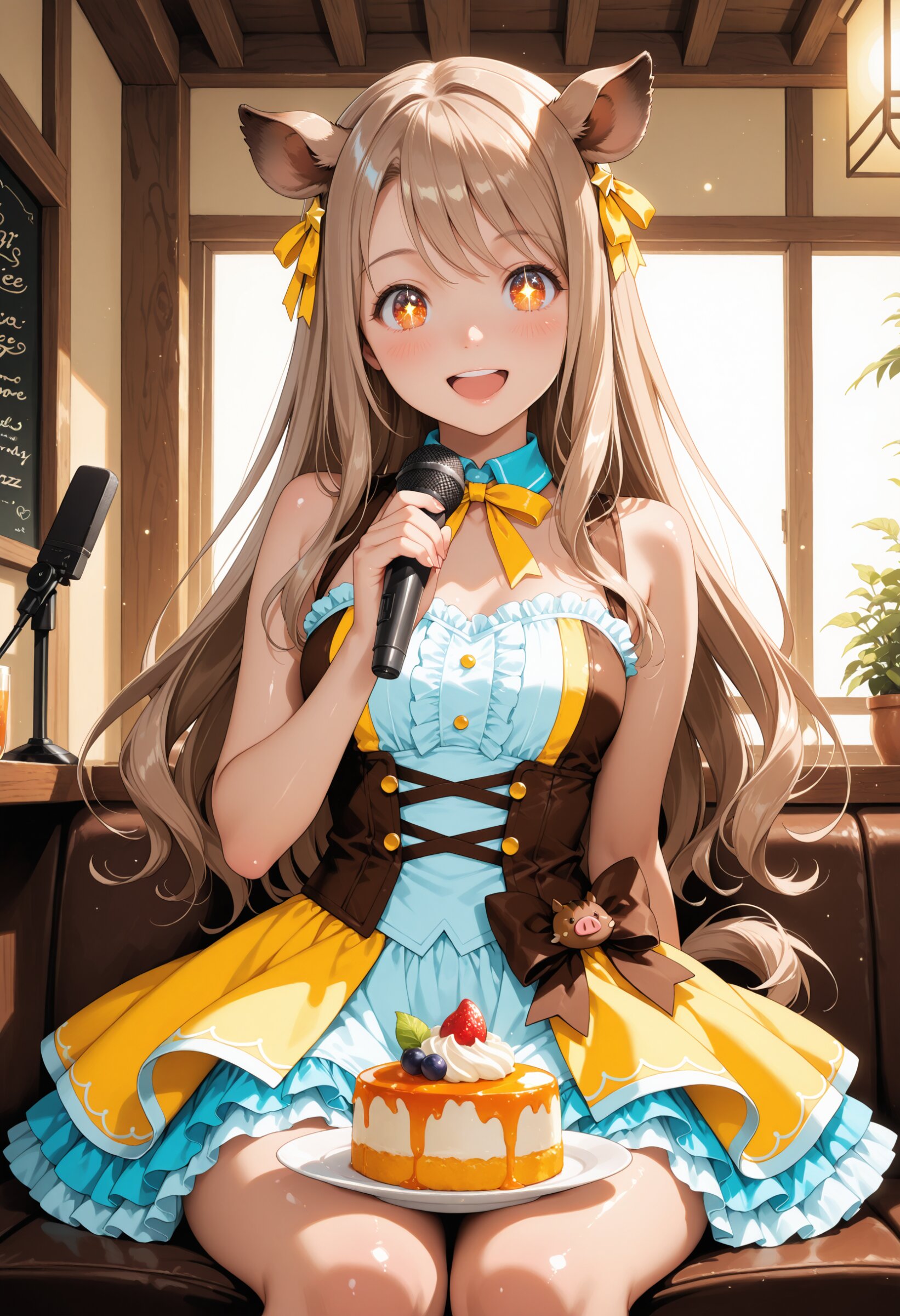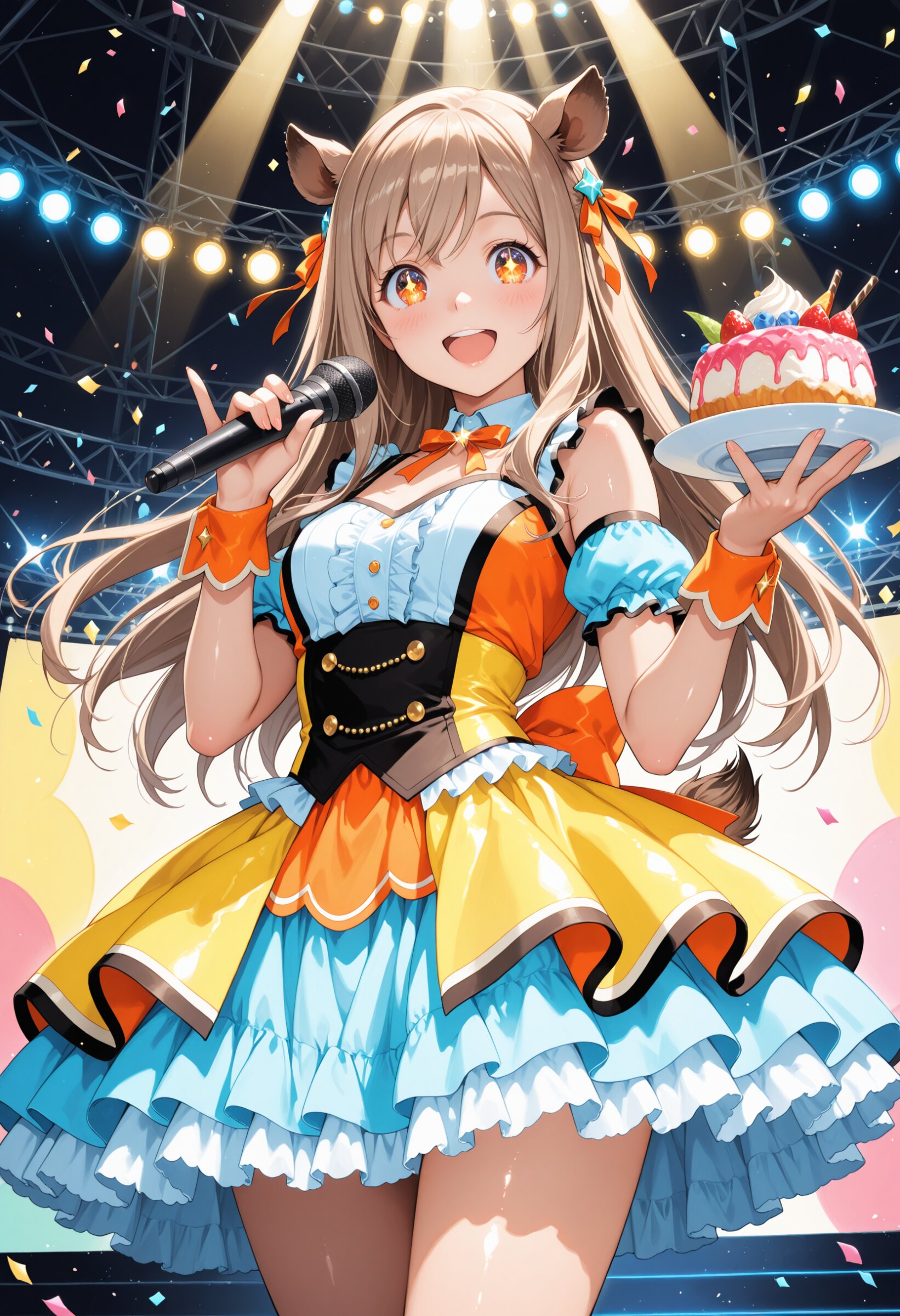A cute anime-style girl idol with long light brown hair flowing smoothly down to her waist, slightly wavy and shiny, moving naturally as she performs, and amber eyes, wearing wild boar ears, performing on a colorful stage while holding a small plate of dessert and singing into a microphone. Wearing a vibrant, animal-themed idol outfit with boar-inspired accessories, a small tail, frilly skirt, ribbons, cute accessories, colorful and shiny costume. Big sparkling eyes, wide smile, cheerful and lively expression. Slightly low-angle shot to emphasize her presence, bright stage lights, confetti, and small floating food items in the scene. Highly detailed shading, soft lighting, expressive anime eyes, dynamic pose, anime-style, cel-shading, soft pastel colors, masterpiece quality, ultra-detailed, realistic long hair, clothing, and food textures, smooth skin, vibrant color palette, cinematic lighting.