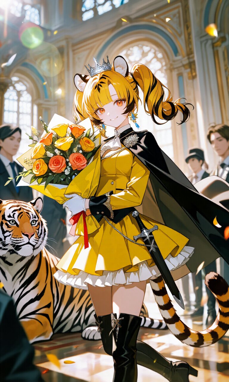 lococo, 1girl, a cheerful young woman with multicolor hair featuring vibrant yellow and black sections styled in twintails with blunt bangs. She has adorable tiger ears atop her head and a fluffy tiger tail swishing playfully behind her. Her delicate face features striking orange eyes and a light smile radiating warmth. She wears an exquisite (Yellow Prince costume with tiger_stripe:1.5) complete with a (black luxurious Cape:1.3) that flows dramatically behind her. The outfit includes a (luxurious mini skirt with frills:1.3) and (black luxurious boots:1.3) with intricate detailing. A gleaming (dagger on waist:1.3) and sparkling (crown:1.3) complete her princely attire, while (White gloves:1.2) add an elegant touch. In the opulent ballroom of a palace with lococo architecture, she stands (surrounded by friends:1.8) at what appears to be a grand birthday celebration, (holding a bouquet in hand:1.5) of vibrant flowers. A majestic tiger lounges nearby as lens flare and bloom effects create a dreamy atmosphere. The hyperrealistic photo captures every detail from the texture of her costume to individual strands of her multicolored hair, with romantic academia elements enhancing the luxurious setting. The lighting creates dramatic highlights on her crown and jewelry while maintaining a warm, inviting glow throughout the scene.