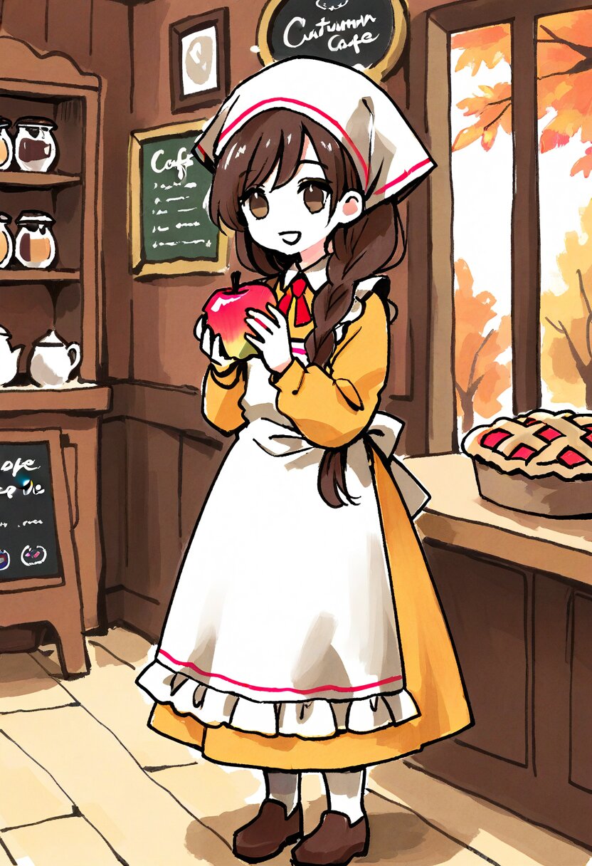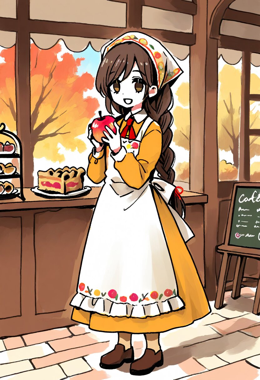 <lora:inmnstyleistkmx:1>best quality, masterpiece, very aesthetic, watercolor painting, general, 1 girl, brown hair, braided long hair, brown eyes, holding apple pie, orange embroidery long sleeve dress, white frilly apron, yellow embroidery headscarf, red ribbon tie, brown shoes, smile, open mouth, antique cafe, autumn