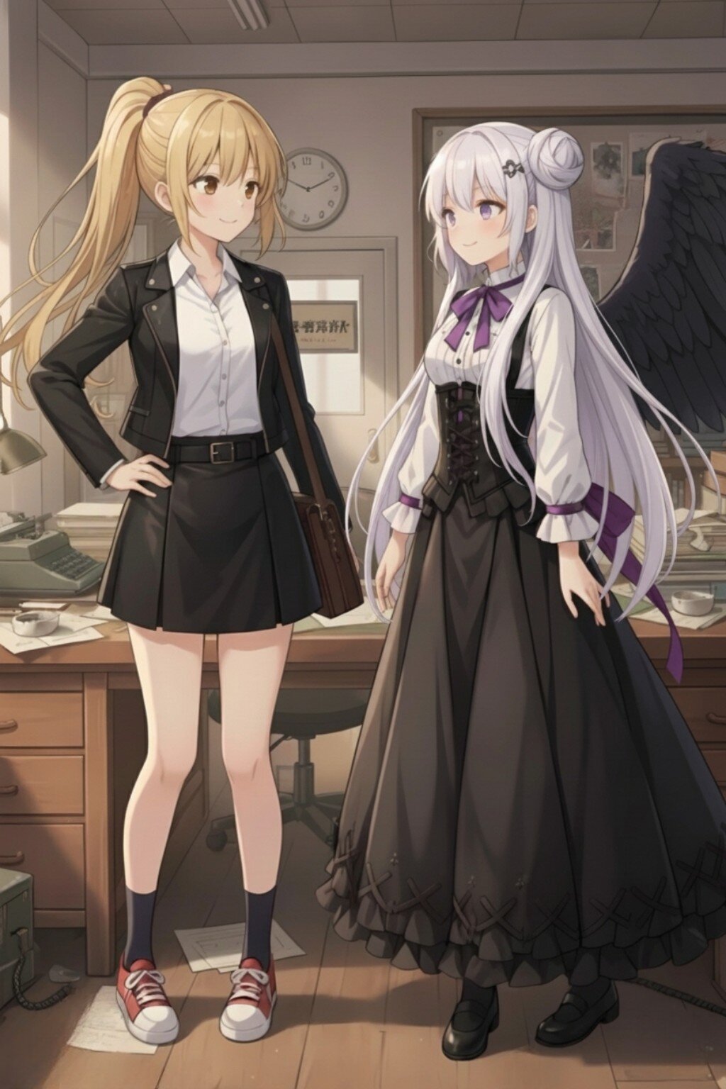 Anime style, two young women, same height, detective agency office, daylight. The left girl, named Kikkawa, has long blonde hair in a ponytail, Brown eyes, wearing a white shirt, black leather jacket, black leather pleated skirt, and red and white sneakers. She is smiling and looking towards the right girl. She works as a private detective at Aoi Detective Agency. The right girl, named Ouran, has short Purple hair in two buns, purple eyes, wearing a white blouse with a purple ribbon, a black gothic style corset dress, and Purple shoes. She has large black feathered wings and a gentle smile. She is a fallen angel, exiled from heaven, who captivates everyone with her eloquent words. The background shows a cluttered detective office with a desk, old-fashioned telephone, typewriter, piles of documents, bookshelves, and a window with venetian blinds and sunlight streaming in. High quality, detailed, soft lighting.