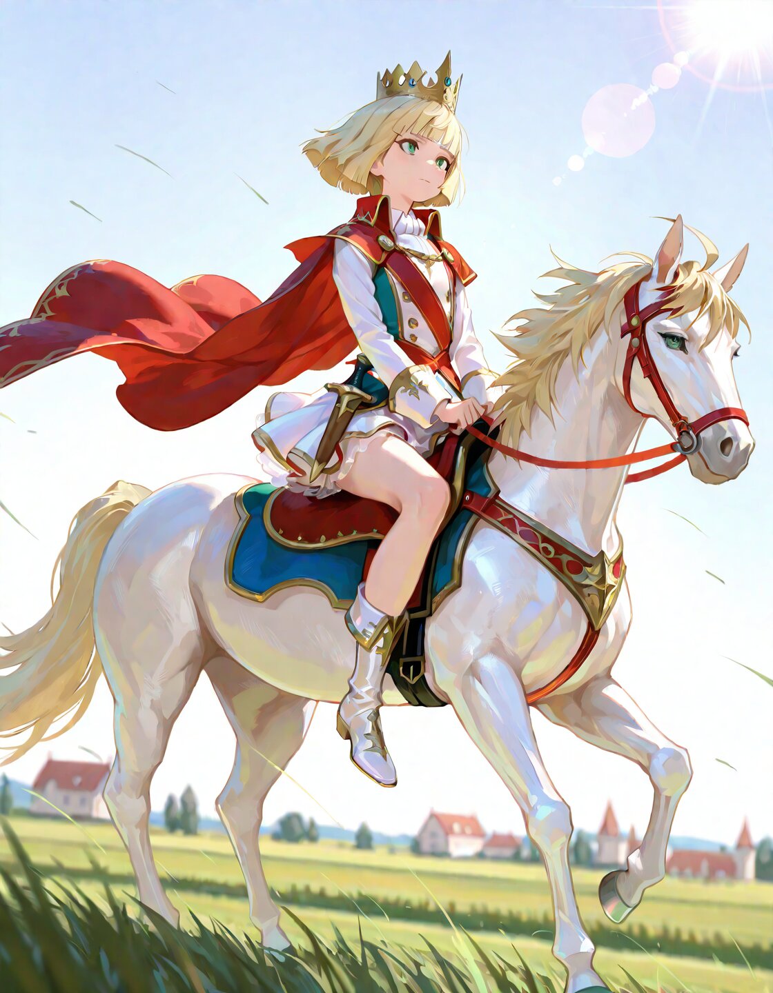 solo,1boy,ahoge,green eyes,blonde hair,blunt bangs,straight hair,short hair,hime cut,delicate face,detailed face,detailed skin,detailed hair,masterpiece,best quality,insanely detailed,beautiful,16k,prince charming,(White prince costume:1.3),(red cape:1.2),long sleeves,flat chest,(dagger on waist:1.3),(crown:1.2),luxurious mini skirt,whiite luxury boots,(riding white horse:1.3),take the reins,(bend knees:1.3),determined, intelligent, looking ahead, in the grassland, in the afternoon,(windy:1.3),classic academia, fantasy, rococo architecture, lens flare, sunlight, shining lights, in focus with blurred background, motion blur,(sense of speed:1.3), speed lines,full body shot