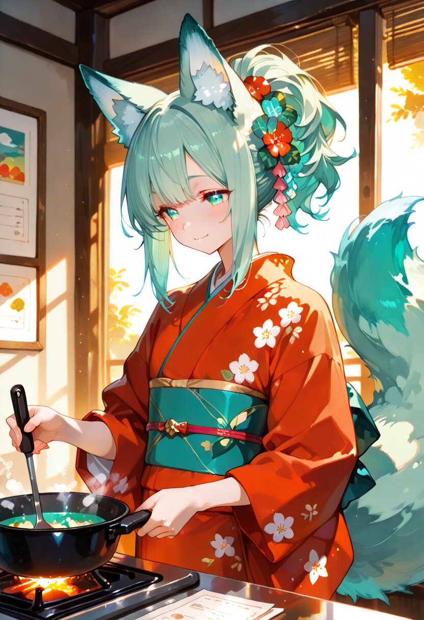 (masterpiece:1.4), (best quality:1.3), (ultra-detailed:1.2), (8k illustration), (beautiful lighting:1.2), (cinematic composition:1.1), (anime illustration:1.3), (vibrant colors:1.1), (soft shading:1.1), (depth of field:1.1), (warm tone:1.2), (pixiv style:1.2), (professional anime art), (detailed background:1.1), (cute anime girl:1.3), (flat chest:1.1), (fluffy fox ears:1.3), (large fluffy fox tail:1.3), (mint green hair:1.2), (high ponytail:1.2), (delicate kanzashi hair ornament:1.1), (wearing a casual red kimono with small floral patterns:1.3), (cooking in a cozy traditional Japanese kitchen:1.3), (colorful ingredients flying in the air:1.2), (soft steam around her:1.1), (joyful and focused expression:1.3), (holding a ladle dramatically:1.2), (presenting a manga-inspired dish:1.3), (gentle smile:1.2), (warm sunlight filtering through paper windows:1.2), (dynamic mid-shot:1.1), (slightly low camera angle:1.1), (fluffy tail spread elegantly:1.2), (soft glowing atmosphere:1.2), (detailed eyes:1.2), (delicate hair strands:1.1), (smooth skin texture:1.1), (cozy kitchen:1.1)