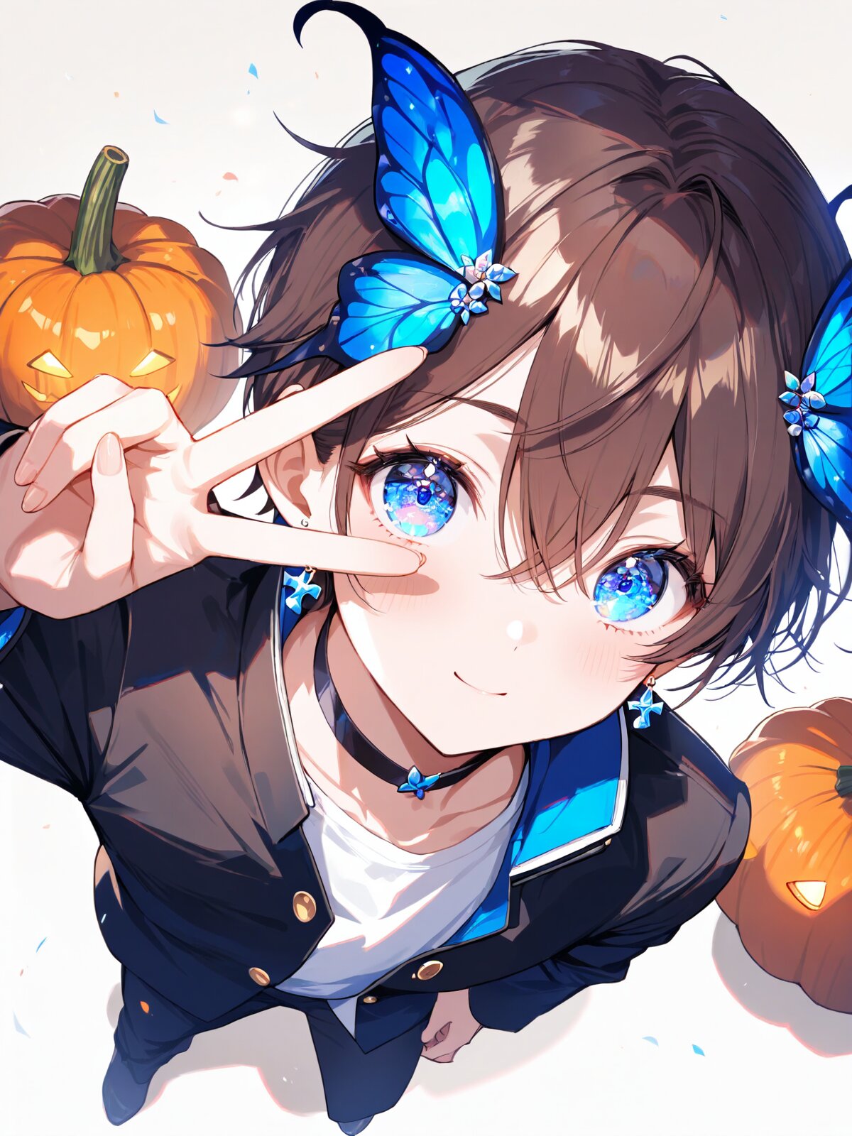solo, male focus, boy, brown hair, open front gakuran, very short hair, hair behind ear, pixie cut, white shirt, blue eyes, succubus, hair between eyes, blue butterfly hair accessory, BREAK, full body, choker, blue Cross earrings, blue inner hair, (tareme:0.6), pumpkin, Halloween, party, simple background, closed one eye, peace sign, dynamic angle