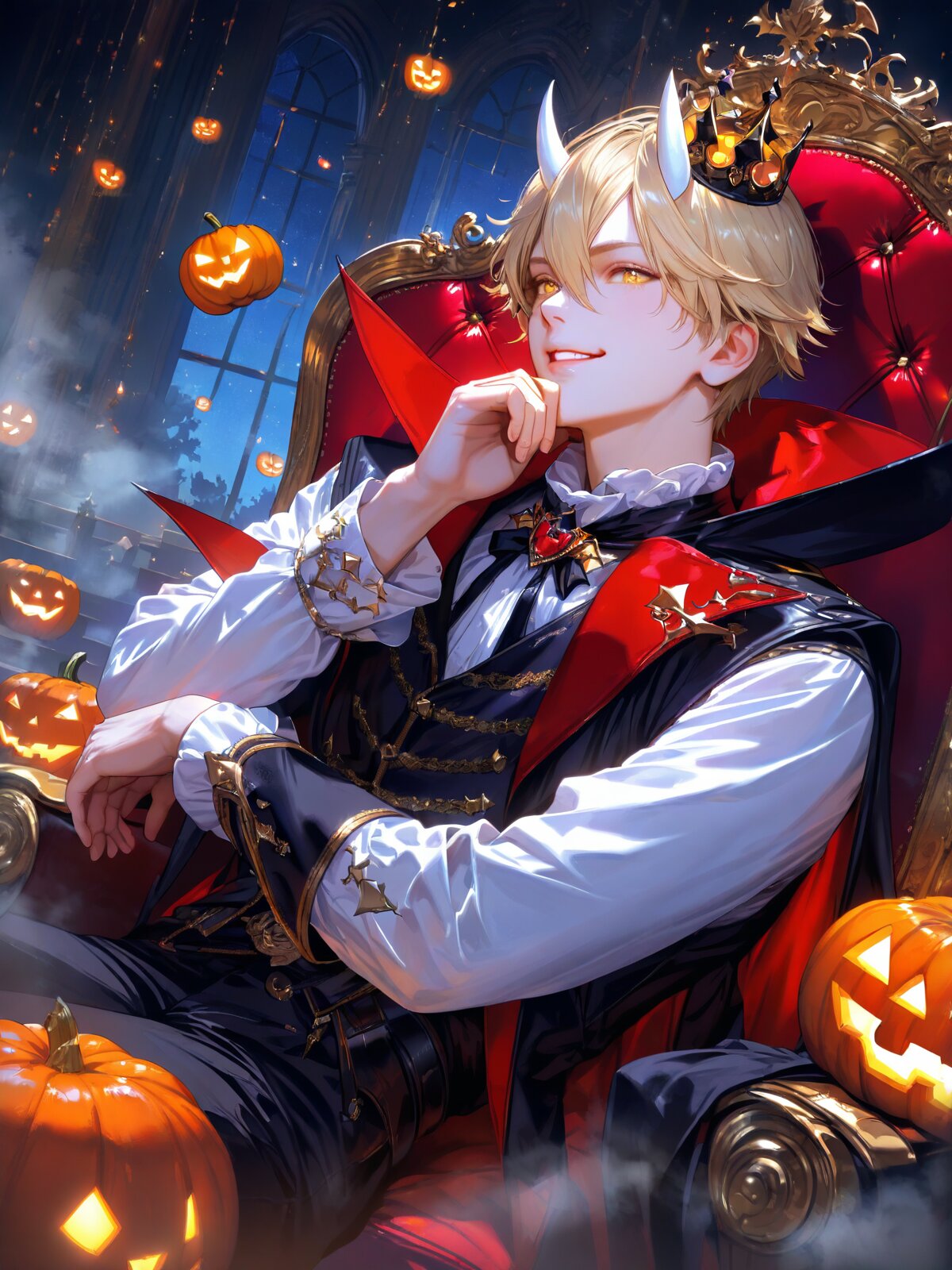 不敵で魅力的な笑顔と、きらめく王冠、赤い裏地のマントがとってもゴージャス!ジャック・オ・ランタンに囲まれた夜の背景も雰囲気抜群で、まるで物語のワンシーンのようです。眼福です!🙏