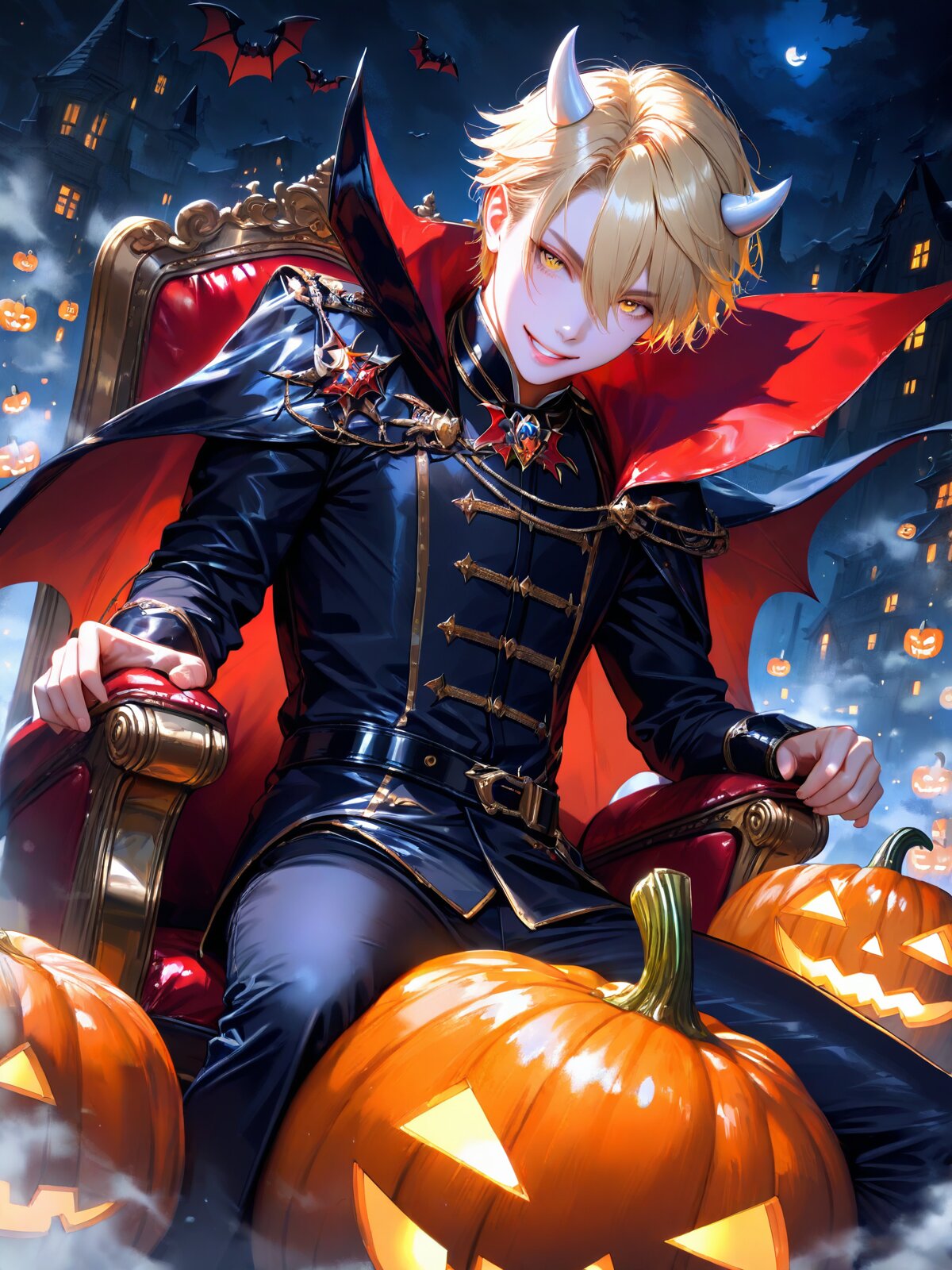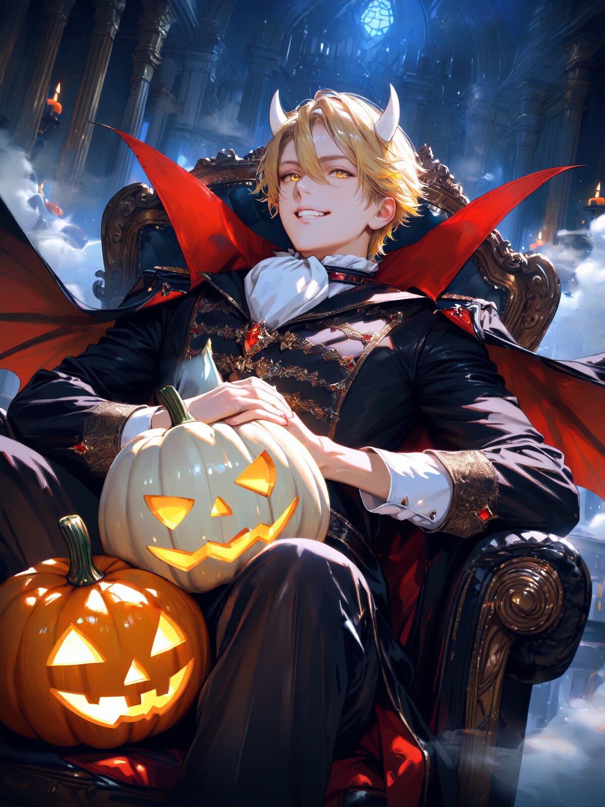 solo, male focus, male, adult, blonde hair, very short hair, pixel cut, hair between eyes, yellow eyes, white skin, white small horns on head, fog, Dracula costume, Dracula wing, Halloween, night, party, prince, grin, pumpkin, fang, cowboy shot, dynamic angle, dynamic action, sit-down, kings chair, throne room, rest one's chin on one's hand, lean back