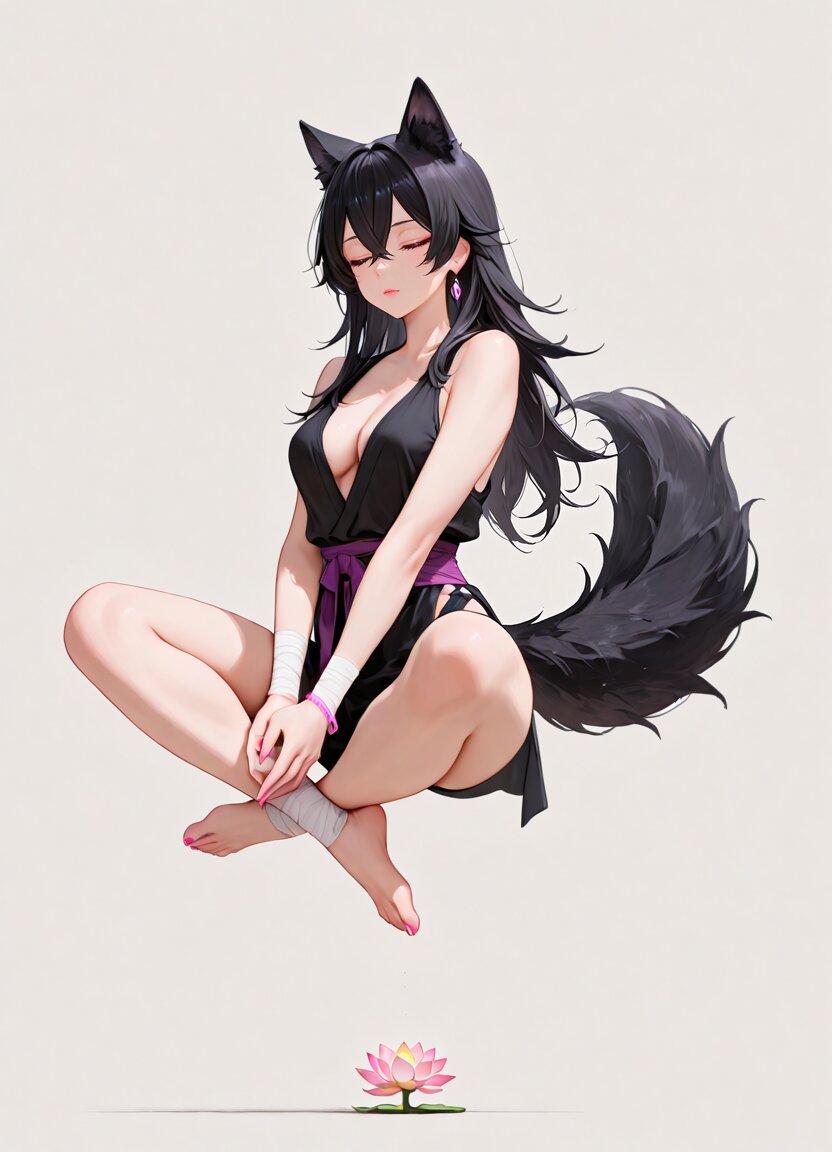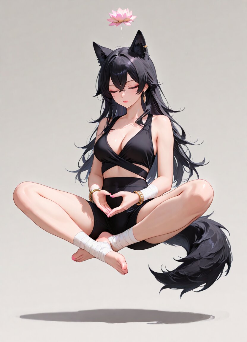 simple background, 1girl,solo,closed eyes,(midair:1.3),(levitation:1.3), ankle wrap,bandages,barefoot,bracelet,crossed legs, earrings,wrist wrap,yoga, lotus position,meditation,mudra,vitarka mudra, full body, BREAK 1girl,20yo,slender,cool-face,medium breasts,cleavage,black hair,long hair,crossed bangs,purple eyes,long_eyelashes,lipstick,wolf ears,black wolf tail,pink nails,, appropriate posture,appropriate configuration,ideal ratio body proportions,perfect anatomy, <lora:Fixhands_anime_bdsqlsz_V1:1>, masterpiece,best quality,newest,absurdres,highres,ultra high res,8K UHD,hyper-detailed,