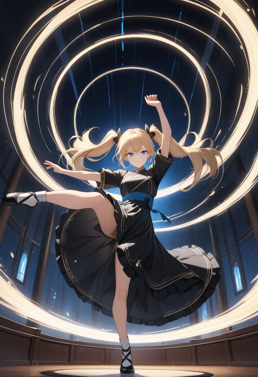 best quality,absurdres,8k,ultra detailed, round house kick,A blonde beauty with twin tails, blue eyes, and a black long dress,arms up.Glowing lines surround her, background jet black
