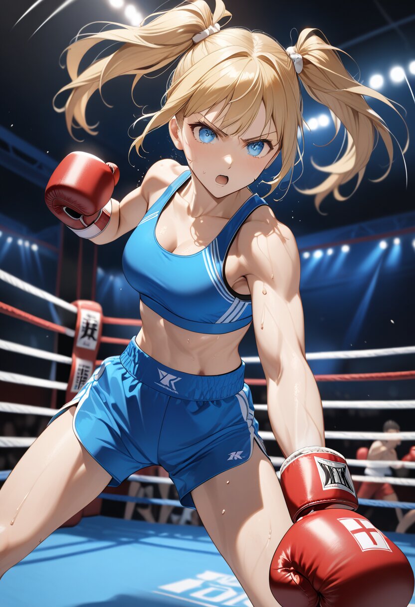 best quality,absurdres,8k,ultra detailed,1girl,A blonde beauty with twin tails, blue eyes, fighting stance, clenched hands, orthodox cross, punching, outstretched arm forward, leaning forward, punching impact, motion blur, dynamic pose, sports wear, sports bra, sports shorts, sweat, boxing gloves, wide shot, boxing ring, looking at boxing ring corner, impact burst on object, dutch angle, blurry foreground,Dynamic motion line