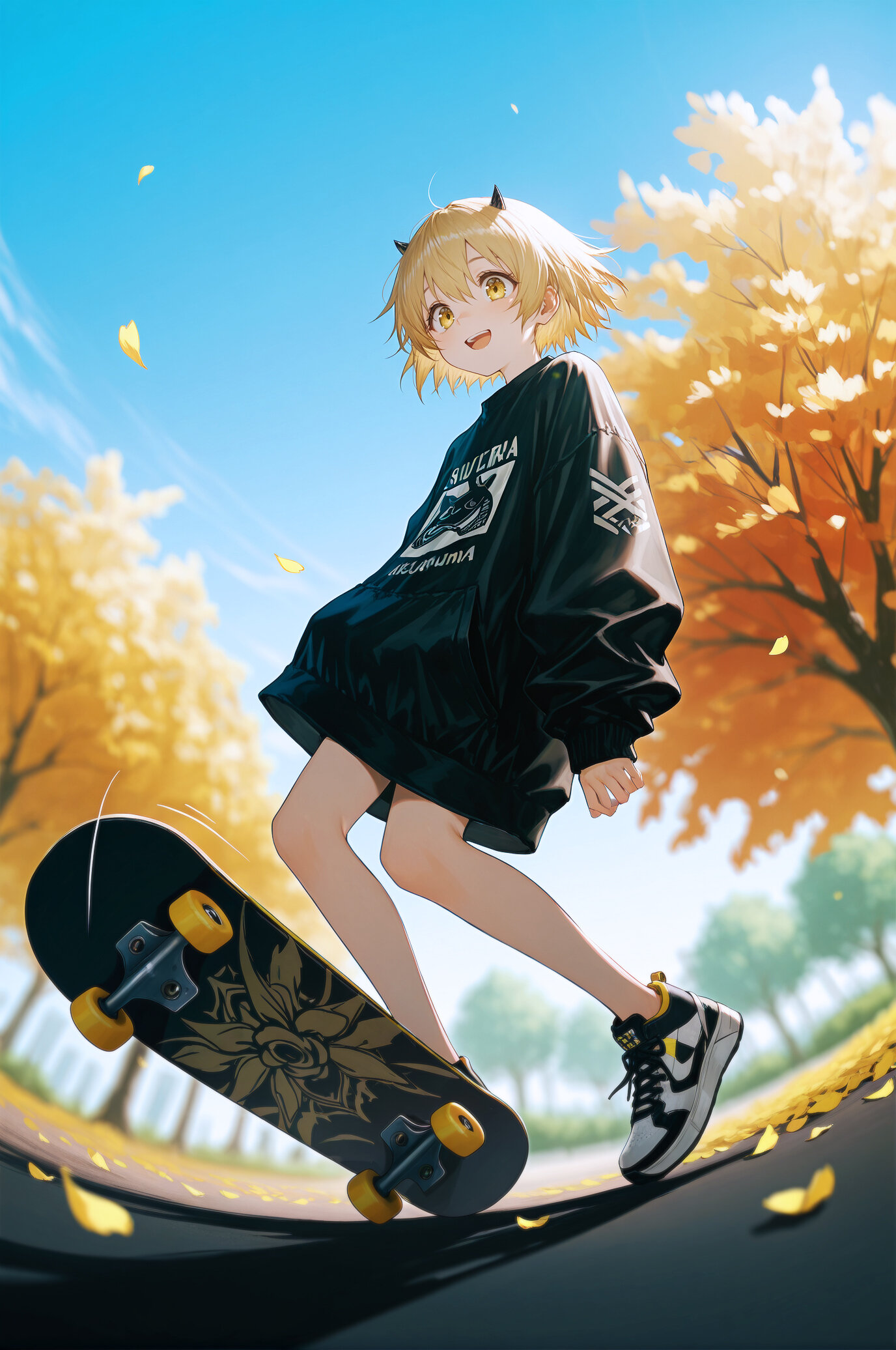 秋の公園でスケボーを楽しむ、学生時代の角っ子くんをイメージして生成してみました(*´▽`*)