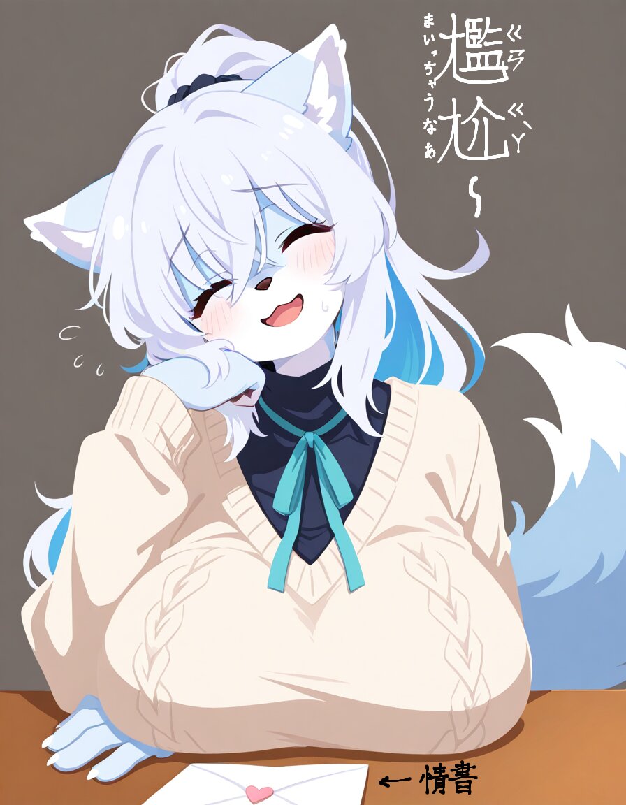 1girl, (wolf girl), (furry female), (snout:1.3), blue fur, wolf ears, ears up, wolf tail, body fur, fluffy fur, wolf paws, (gigantic breasts), sagging breasts, slim, wide hips, thick thighs, silver hair, hime-cut, long hair, colored inner hair, ponytail, hair between eyes, hair over eyes, eyes closed, long bangs, raised inner eyebrows, revealing clothes, undersized clothes, high collar, black collar, blue neck ribbon with loose ends, layering, separated turtleneck and sweater vest, v-neck beige sweater, aran sweater, black turtleneck under sweater, long sleeves, embarrassed, smile, flying sweat drops, open mouth, white table, head tilt, head rest on hand, arm rest on table, holding the letter between her fingers, letter on the table, from front, three-quarter view, breast focus, close-up, gray background, simple background, hair shade, ((high contrast)), (digital art:1.1), (anime coloring), (kawaii), softy, (2D), (cute), furry, (two tone fur), (furry body), perfect body, detailed face, high quality, cute clothes, animal tail, animal ears, solo, masterpiece, ((correct_anatomy)), pretty and cute, comical, simple, anime, Bright colors, Contour line, pale painting, gddw, (detailed_hands:1.5), flat color, no lineart, close-up, eye focus
