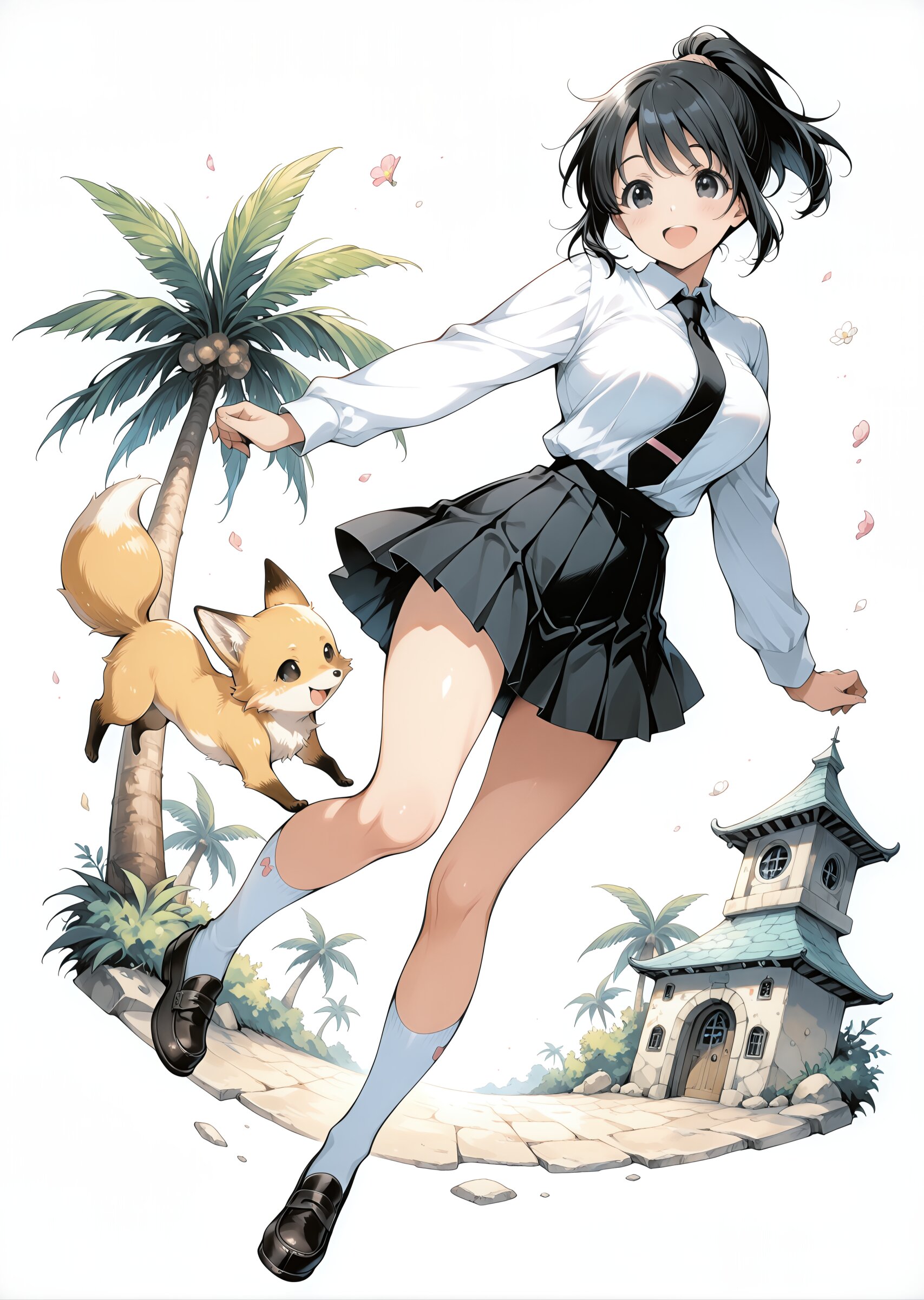 Best quality, Masterpieces, simple background, negative space, delicate anime-style illustration, white background, fine detail, 1girl and 1animal, 1girl, (young girl), cute face and eyes, big breasts, black hair, clear black eyes, single short ponytail hair, cute and lovely, Vigorous, lively, and spontaneous personality, smile, open mouth, dynamic pose, cinematic angle, happy, cute small fox cub, long sleeve, white collared mandarin shirt, black necktie, black pleated skirt, white socks, loafers, two-tone background, soft pastel colors, minimalistic, solid color, no texture, Bali village street, simple stone gate, palm trees, soft tropical light, minimal island scenery, V