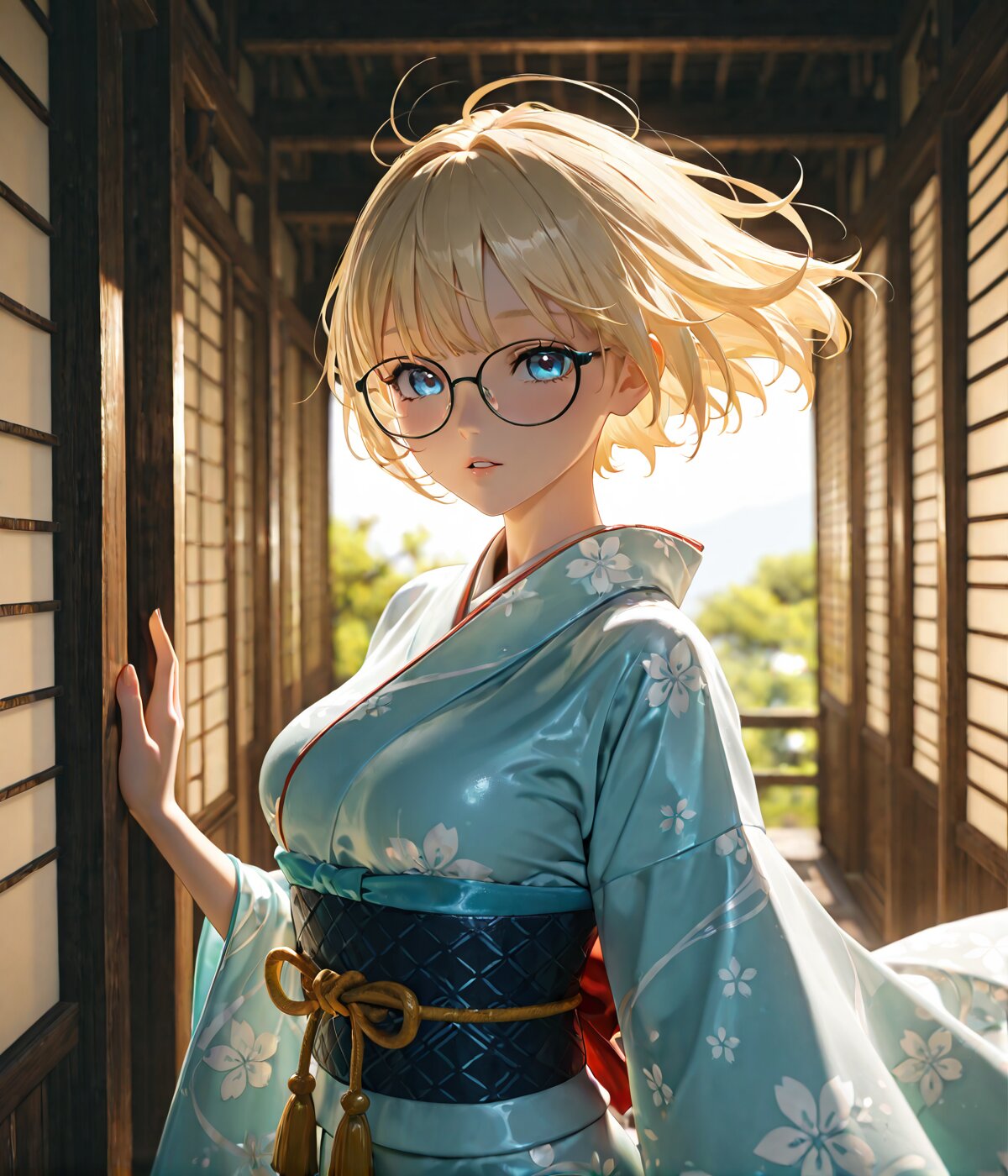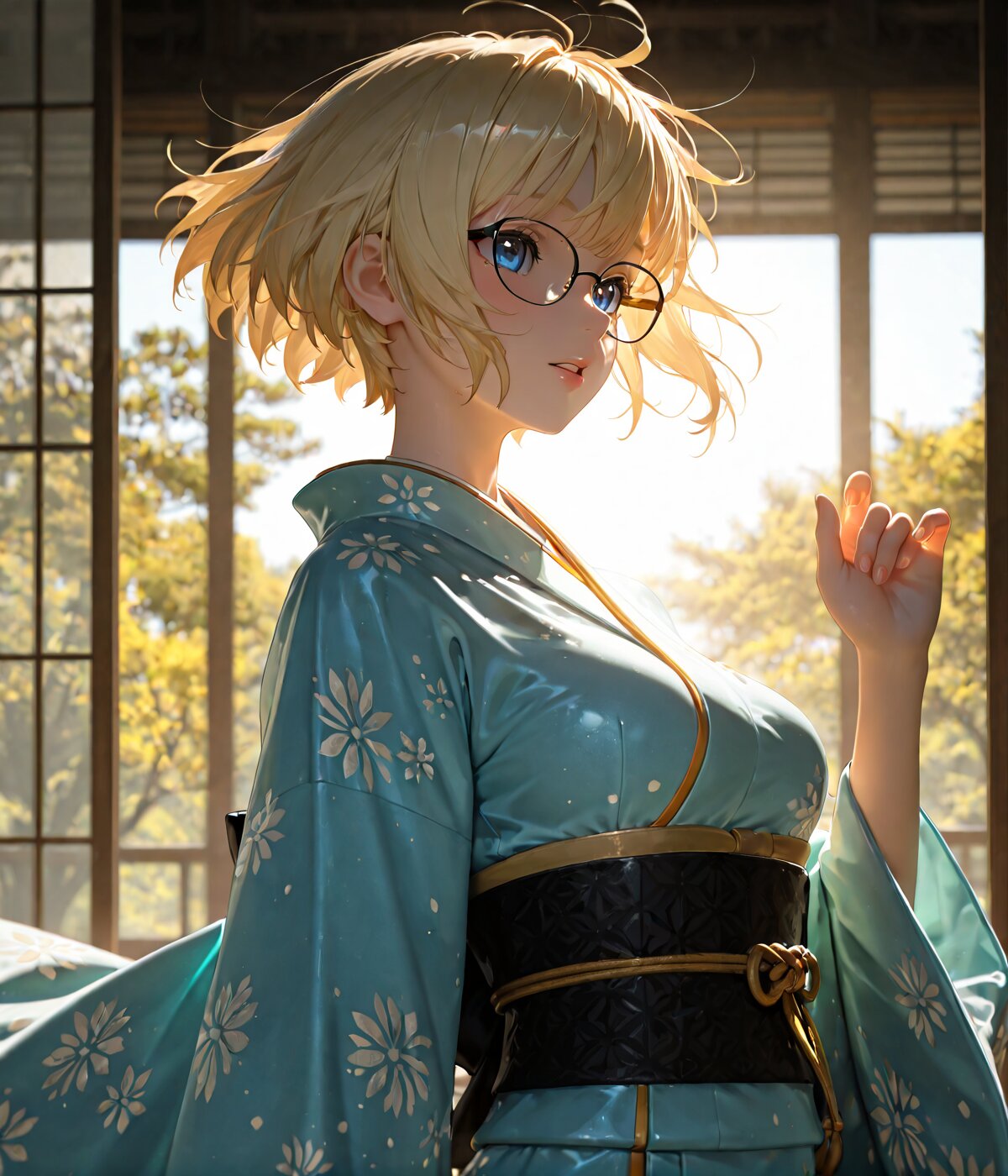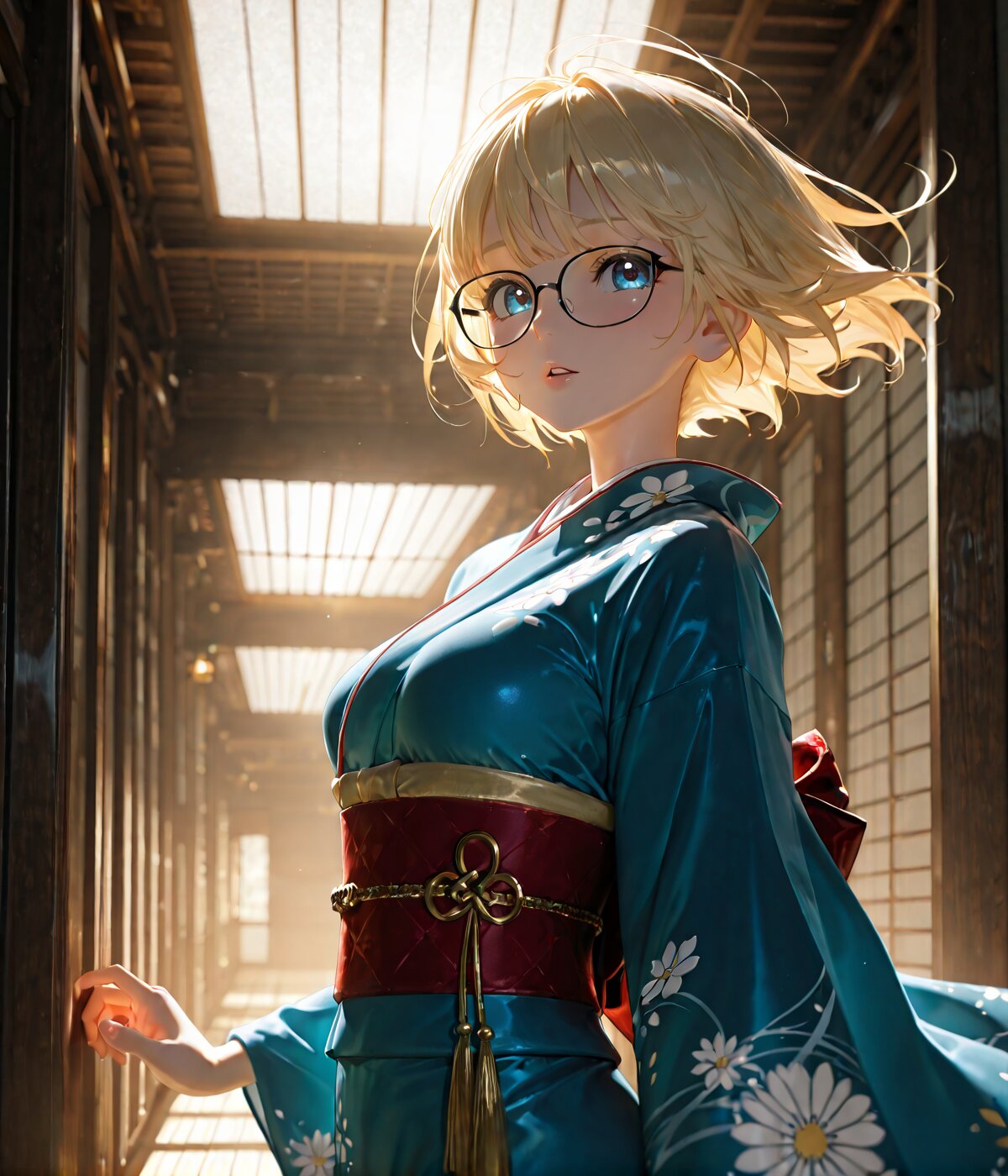 masterpiece, best quality, amazing quality, 4k, very aesthetic, high resolution, ultra-detailed, absurdres, newest, scenery, 3d, rendered, 1girl, solo, glasses, blonde hair, short hair, choppy bangs, parted lips, blue eyes, furisode, medium breasts, dynamic, soft lighting, floating hair, BREAK, hands, fingers, vignetting, dramatic shadow, cinematic lighting, rim light, detailed background, depth of field, vignetting, volumetric lighting