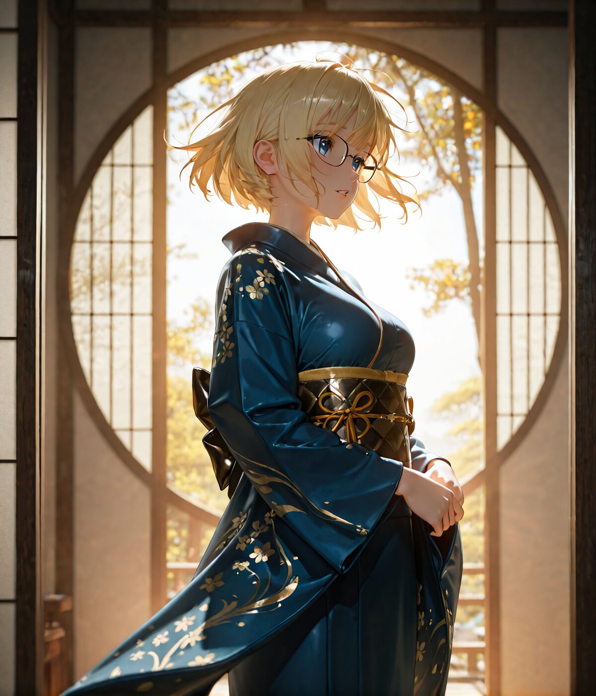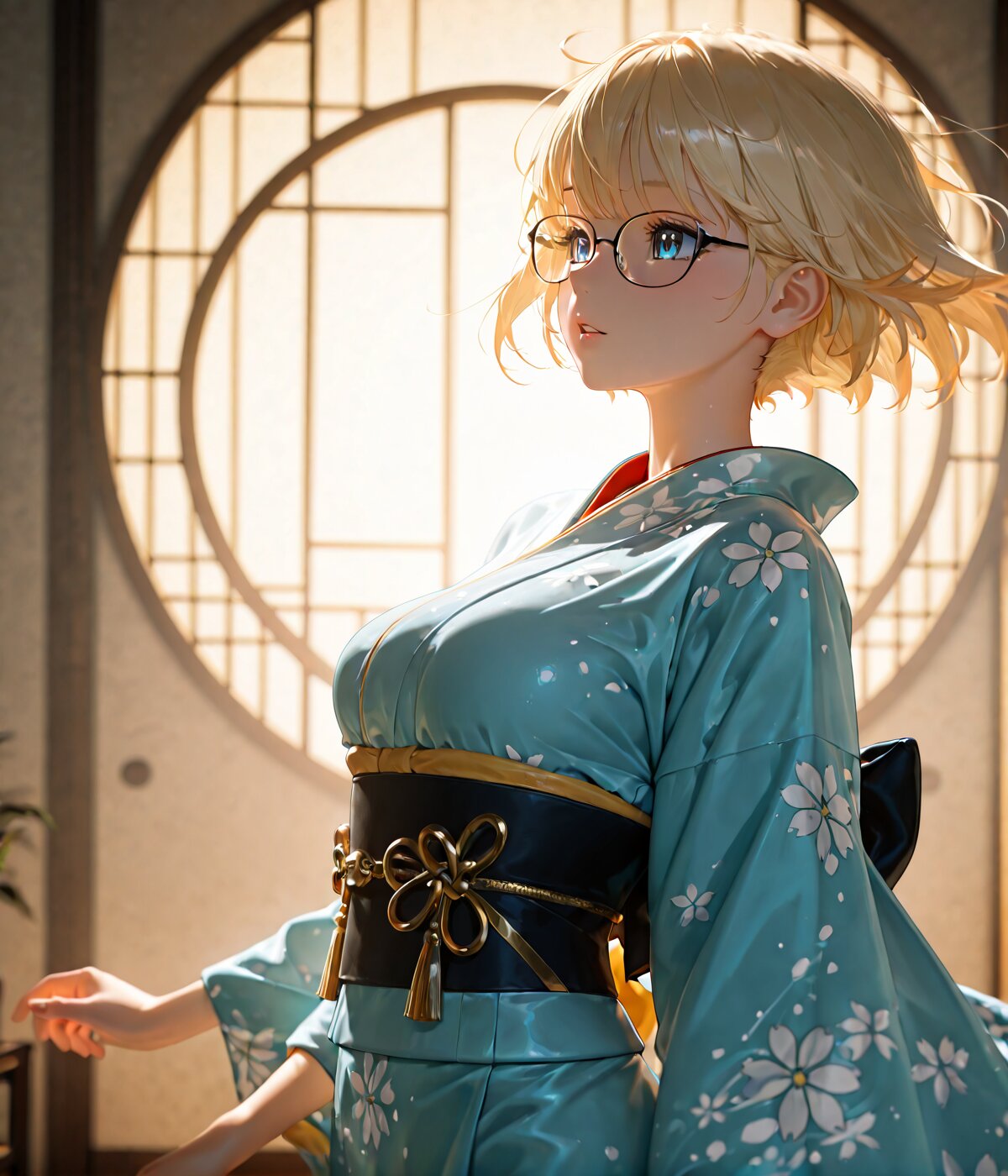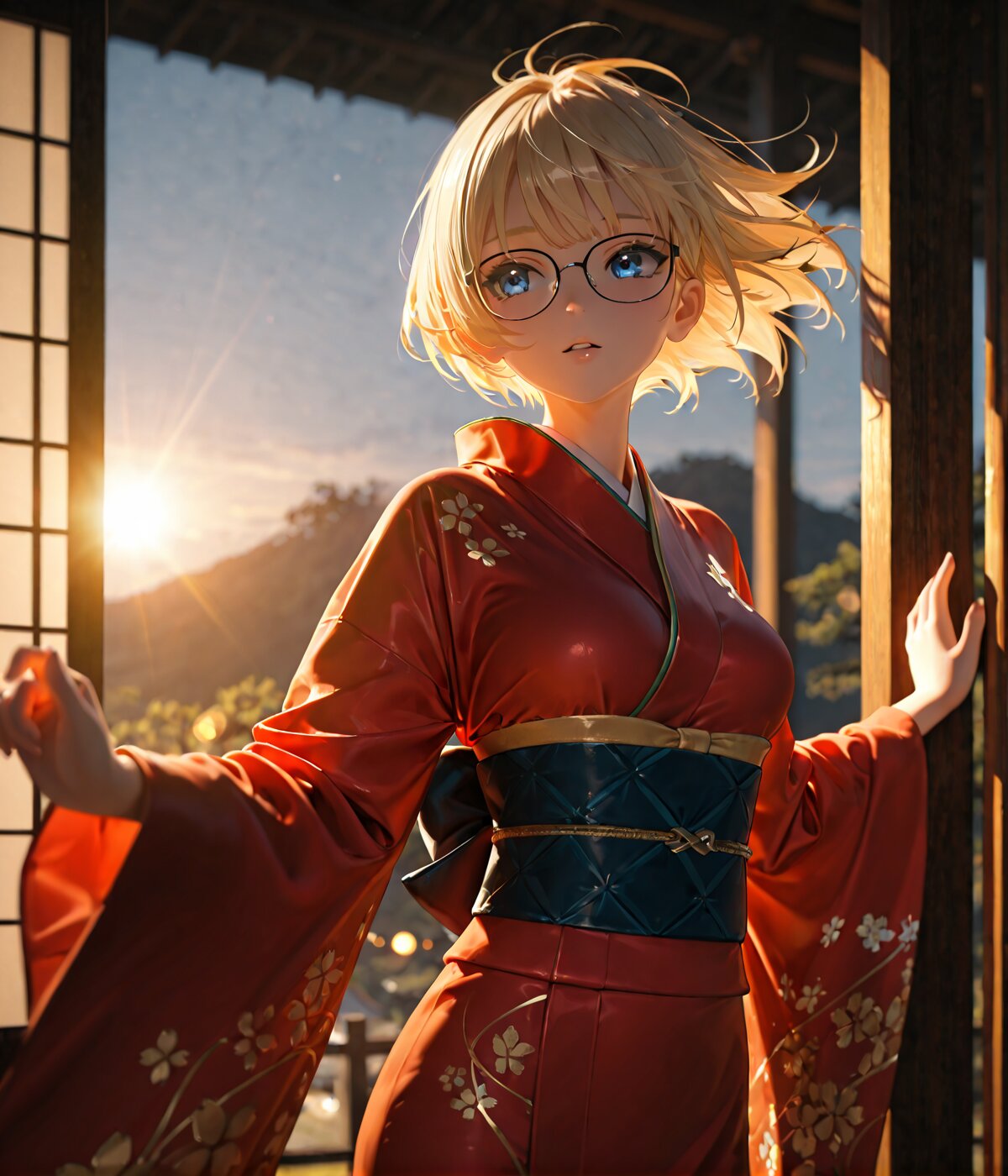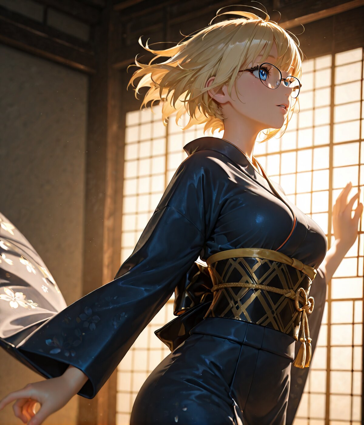 masterpiece, best quality, amazing quality, 4k, very aesthetic, high resolution, ultra-detailed, absurdres, newest, scenery, 3d, rendered, 1girl, solo, glasses, blonde hair, short hair, choppy bangs, parted lips, blue eyes, furisode, medium breasts, dynamic, soft lighting, floating hair, BREAK, hands, fingers, vignetting, dramatic shadow, cinematic lighting, rim light, detailed background, depth of field, vignetting, volumetric lighting