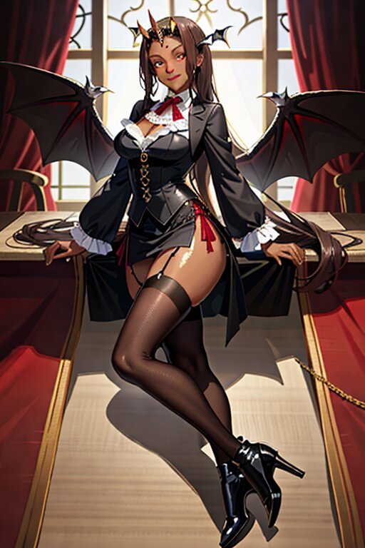 ■ Appearance - Age: Female, Mid-20s - Features:horn(singe:1.6)(center of the forehead:1.4)(straight)(big:1.2)(No other horns:1.3),(Bat-like wings on back: 1.3), (Bat-like wings on back: 1.3) - Eyes: Black with light brown pupils. - Lips: (Thick: 1.3), Blood-red lips. - Hairstyle: Black hair, waist-length ponytail. - Skin: (Smooth, shiny dark brown skin: 1.6) - Breasts: Largest breasts. - Atmosphere: A cool and beautiful secretary. Always smiling in front of her master. Her skin is smooth, shiny dark brown, and glows warmly under dramatic lighting. ■ Clothing - Top: Luxurious women's butler's uniform (dark brown, gold embroidery, sequins), ribbon tie, and ruffled blouse. - Bottoms: A slit skirt to match the top. - Underwear: Red high-leg string panties (side ribbons) - Legs: Metallic fishnet stockings, garter belt - Accessories: Gold cufflinks (with raspberry-colored jewels) - Shoes: Black long boots (with silver laces) - Favorite colors: Brown, black Dramatic lighting, contrast, flattering rim light on skin, delicate texture, full-body display