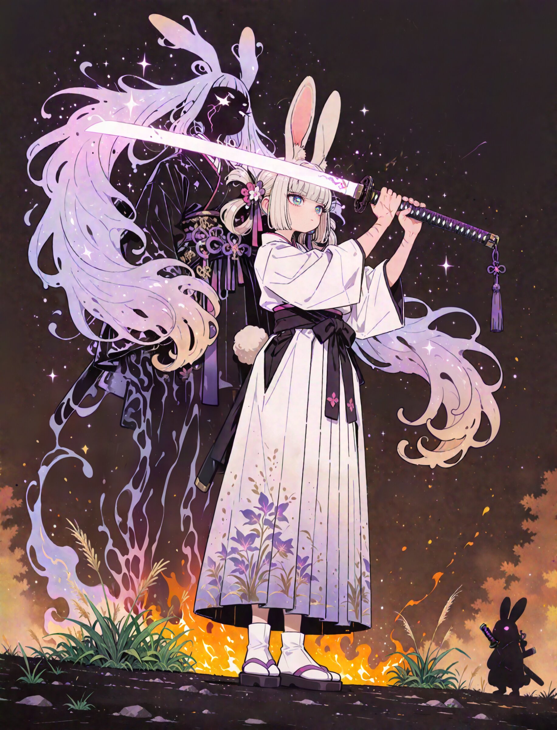 cinematic angle,viewfinder , dynamic angle, autumn atmosphere, earthy color, glowing light purple rabbit energy, light purple silhouette of serious rabbit guardian, huge rabbit aura, 1girl, samurai, (muscular female:0.65), platinum blonde hair, vanilla colored tips, prehensile hair, quad tails hime cut , airy hair, diamond-shaped pupils, beautiful emerald eyes framed breasts, scar on hand, scar on arm, ,, (holding Japanese pearl white sword:1.3), scabbard, (pearl white japanese clothes:1.0), kanzashi, sakuramon, sandals rabbit ears, rabbit tail, tabi, giggling, , arms up (swirling ink effects:1.2) chasing, beautiful metallic luster, sharp katana, ultra detailed katana, silver particles, light trail, The background is a solid, bright light purple, creating a striking contrast with the intricate, multi-colored design of the character, (standing silhouette:1.0), pop color background, (high saturation:1.2), drop shadow, ink-drenched shadows, solid black shadow blocks, abstract ink swath background, heavy chiaroscuro, high-contrast inky shading, negative space, grunge texture, calligraphic strokes, susuki grass, super fine concept art, 8K, graceful eyes, masterpiece, best quality, amazing quality, very aesthetic, absurdres, newest, professional art lots of details, , overexposure, sumie effect style, 4ur4_illu,shiny, glowing, glowing particles, glowing light particles, light particles, flame, <lora:noline (1):-0.5> <lora:sdxl2-flat2-512b:0.2> <lora:facelightup_xl_v10:0.5> <lora:V2_yakumo_alchemy:0.5> <lora:Aura_illu:0.1>