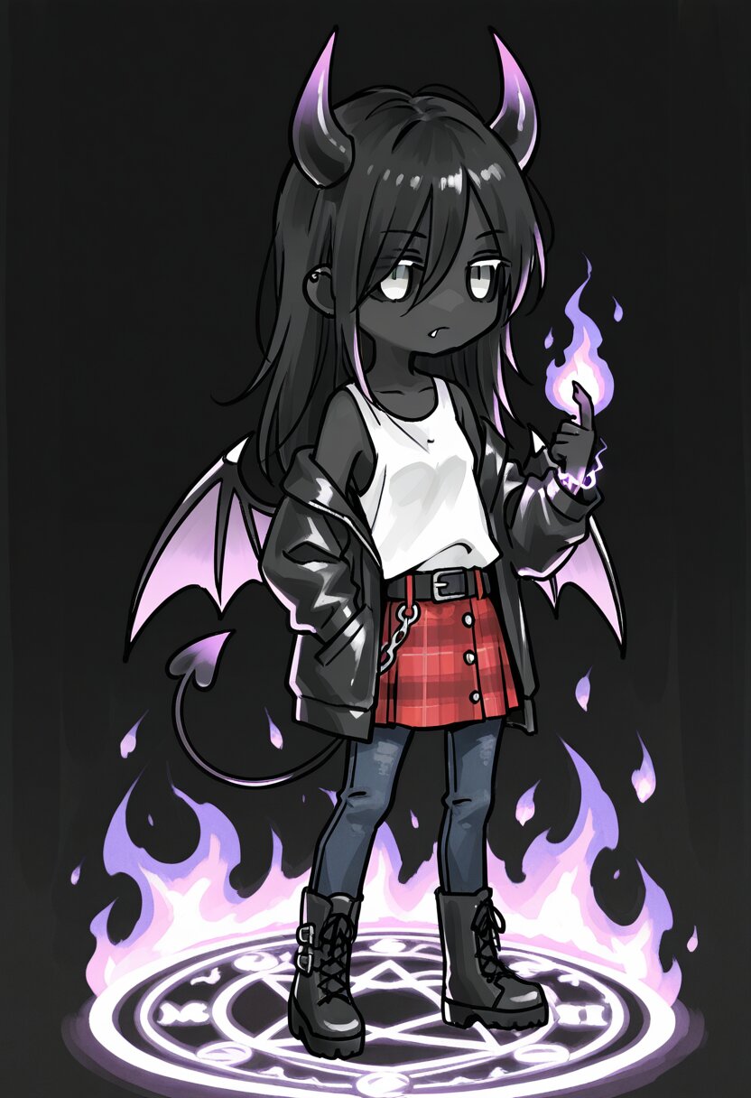 <lora:inmnstylilxl:0.8>, best quality, masterpiece, very aesthetic, watercolor painting, general, 1girl, chibi, solo, black skin, black long hair, white eyes, black sclera, fang, devil horns, devil wings, devil tail, white tank top, loose black jacket, bare shoulder, red plaid skirt, black belt, silver buckle, chain, skinny jeans, black boots, purple fire on hand, magical circle, black background