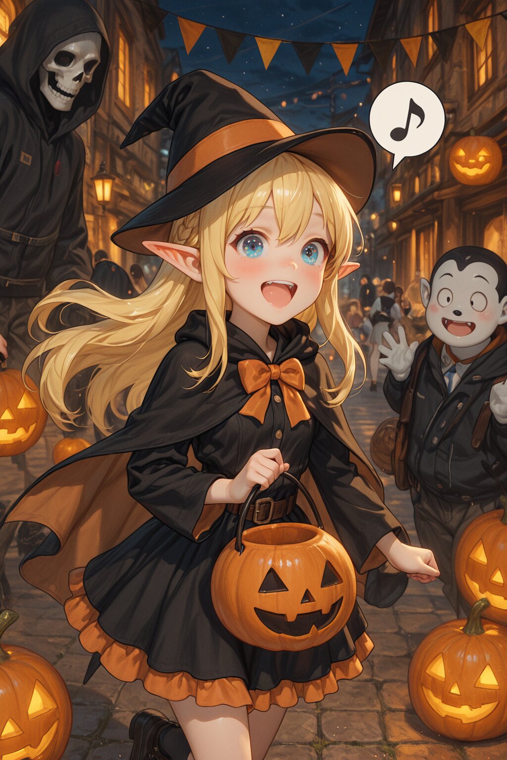 An illustration reminiscent of a movie poster. The dynamic composition and scenery are reminiscent of the final scene of a movie. The heroine is a cute, Japanese anime-style elf girl with blonde hair and blue eyes. She is wearing a Halloween witch costume. She is strolling through a town decorated for Halloween. She seems to be having fun meeting people dressed as Halloween monsters. anime style, anime color, <lora:elf-san_alpha1(AnimagineV31):0.7> <lora:elf-san_alpha4(IL1.0):0.7>, masterpiece, amazing quality, very aesthetic, high resolution, ultra-detailed, absolute, newest, 2d, semi-realistic, moe heroine, sharp focus,