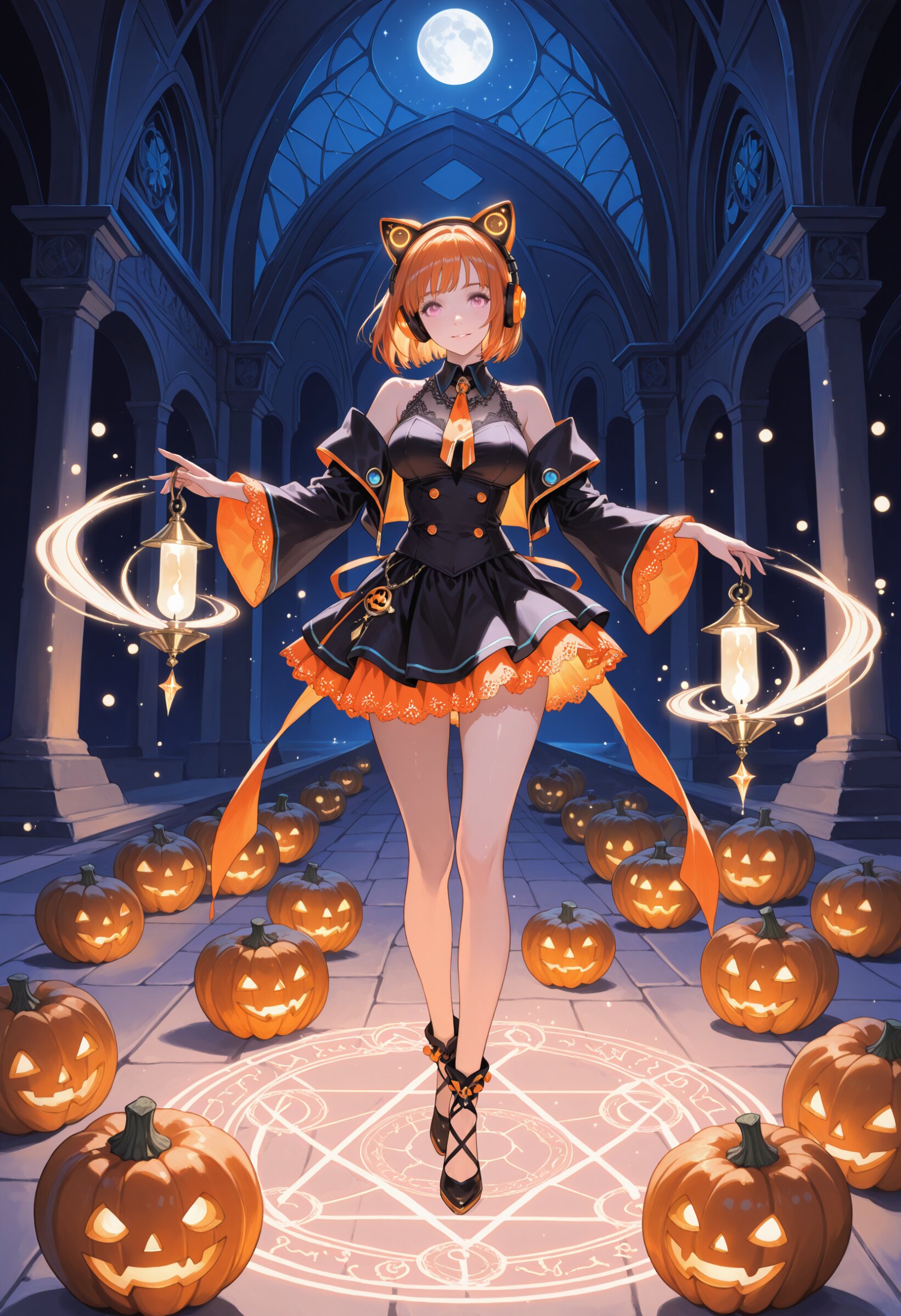 Ultra-detailed cinematic portrait of Zena, a Japanese cyber-pop idol student with vivid orange bob hair glowing like candlelight, and her signature futuristic orange headphones shimmering softly with magical runes. She stands within the grand courtyard of the Magic Academy’s Halloween Festival, surrounded by floating mystical pumpkins, luminescent candy charms, and a glowing, intricate magic circle that rotates beneath her feet like living light. Her costume is an elegant mini-skirt outfit with shoulder slits, combining witch-like lace and cyber accessories in hues of orange and pink. Tiny floating spirits dance around her as her headphones pulse in rhythm with the festival’s mysterious melody. The background reveals students casting light spells, lanterns shaped like cats and moons, and ancient runes drifting in the twilight air. The entire scene radiates a mystical yet kawaii Halloween atmosphere, filled with the warmth of magic, music, and starlight. Style: ultra-realistic, delicate lighting, fantasy cinematic atmosphere, fine texture detailing, 8K resolution, soft glowing colors, ethereal bokeh, magical realism.