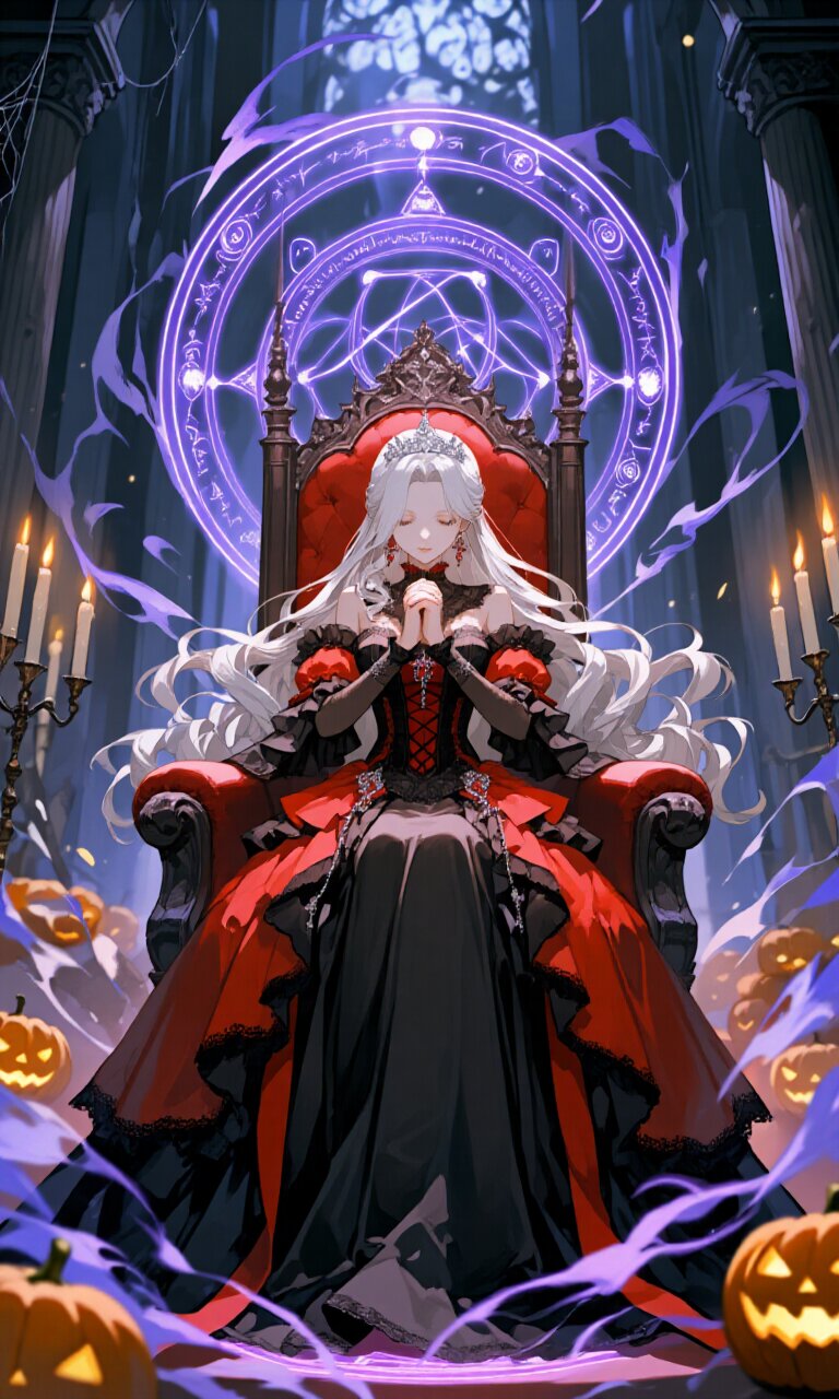 growing magic Circle,a beautiful woman praying in the center of the wizardry,Halloween Queen, tiara, seated on the Halloween throne. red and black haute couture,