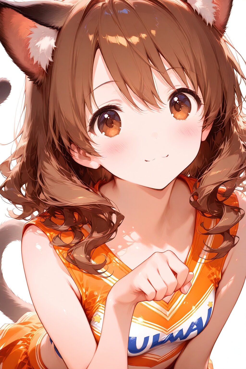 (best quality),(masterpiece),(ultra detailed),1 girl, chestnut brown cat ears, brown eyes, chestnut brown wavy bob hair, hair between eyes, loose inward curls, natural cat tail, (cheer girl), smile, paw pose, jumping