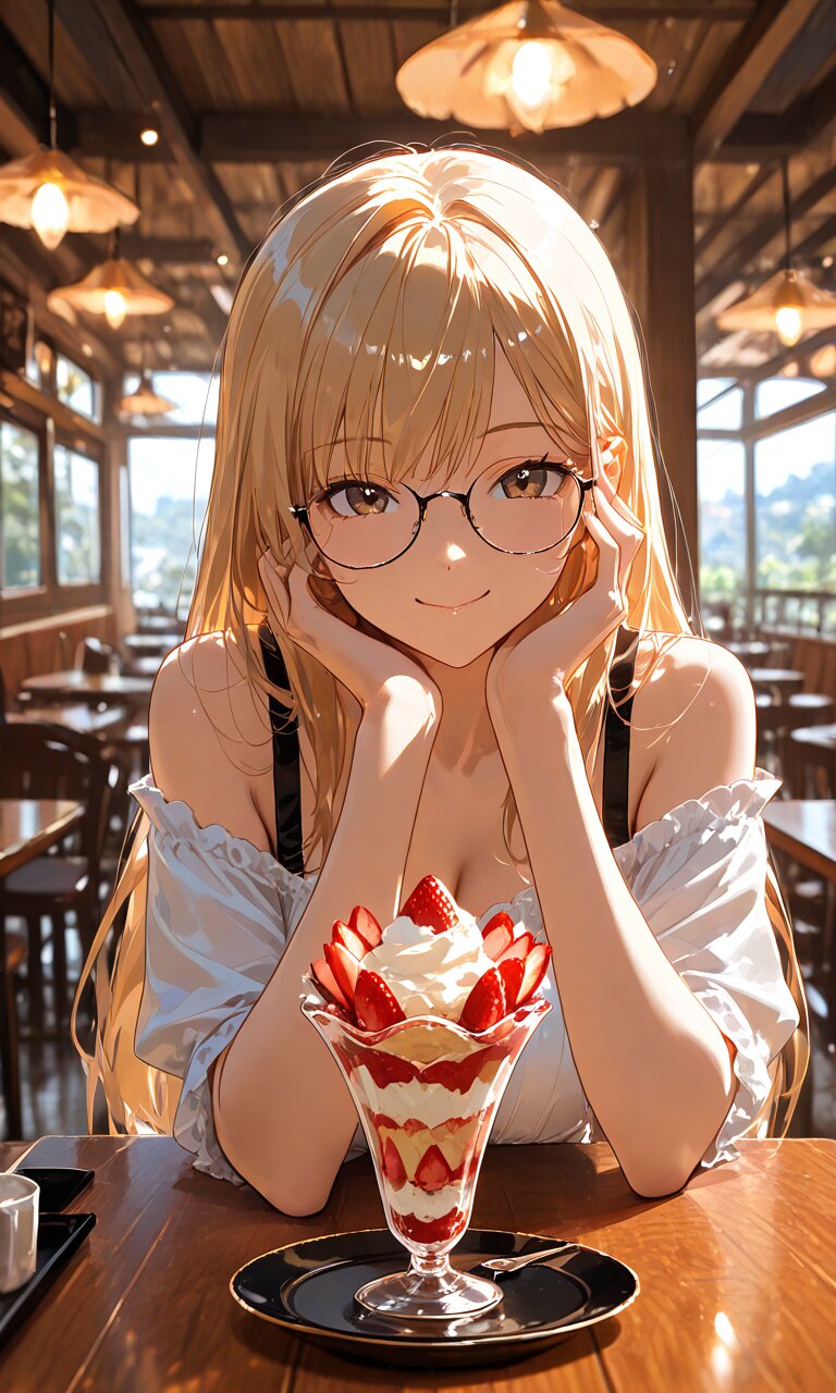 (best quality),(masterpiece),(ultra detailed),1 lady, long hair, blonde hair, glasses, restaurant, parfait, smile
