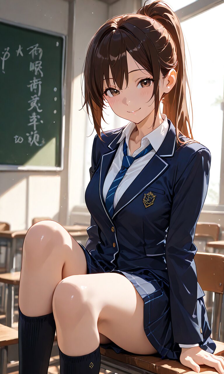(best quality),(masterpiece),(ultra detailed),1 lady, brown hair, long ponytail, smile, school uniform, blush