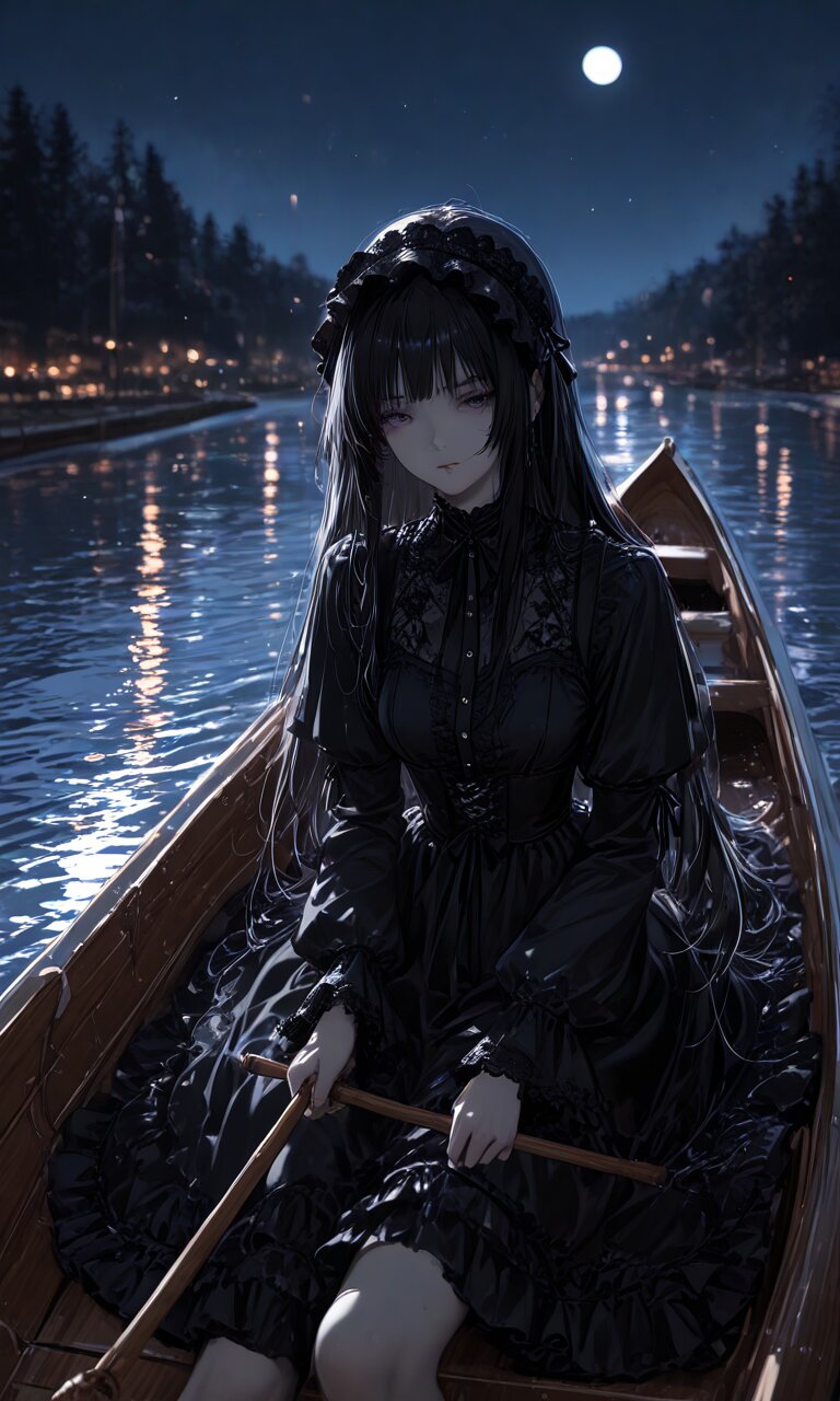 (best quality),(masterpiece),(ultra detailed),,1 lady, night, (rowing a boat), river, on boatdark , goth
